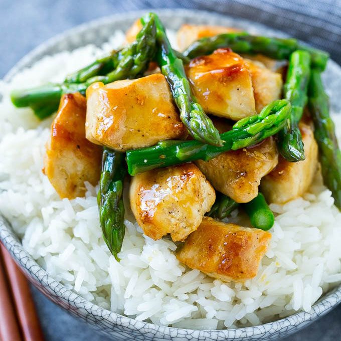 This chicken and asparagus stir fry is chicken breast pieces and fresh asparagus, cooked to perfection and coated in a savory sauce. A light and healthy dinner that's ready in under 30 minutes.