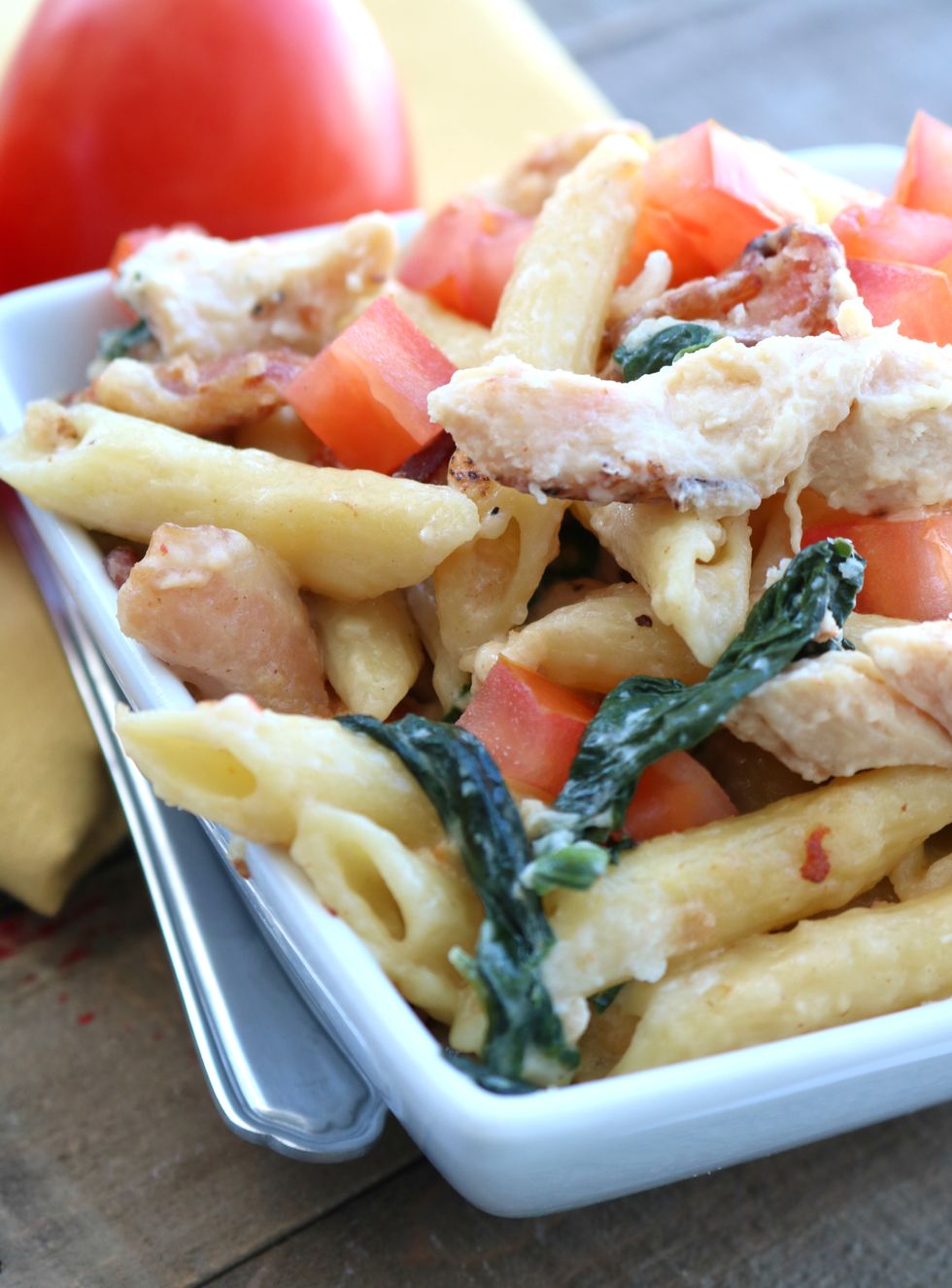 This chicken and bacon pasta is easy to throw together, is creamy, and has so much flavor.