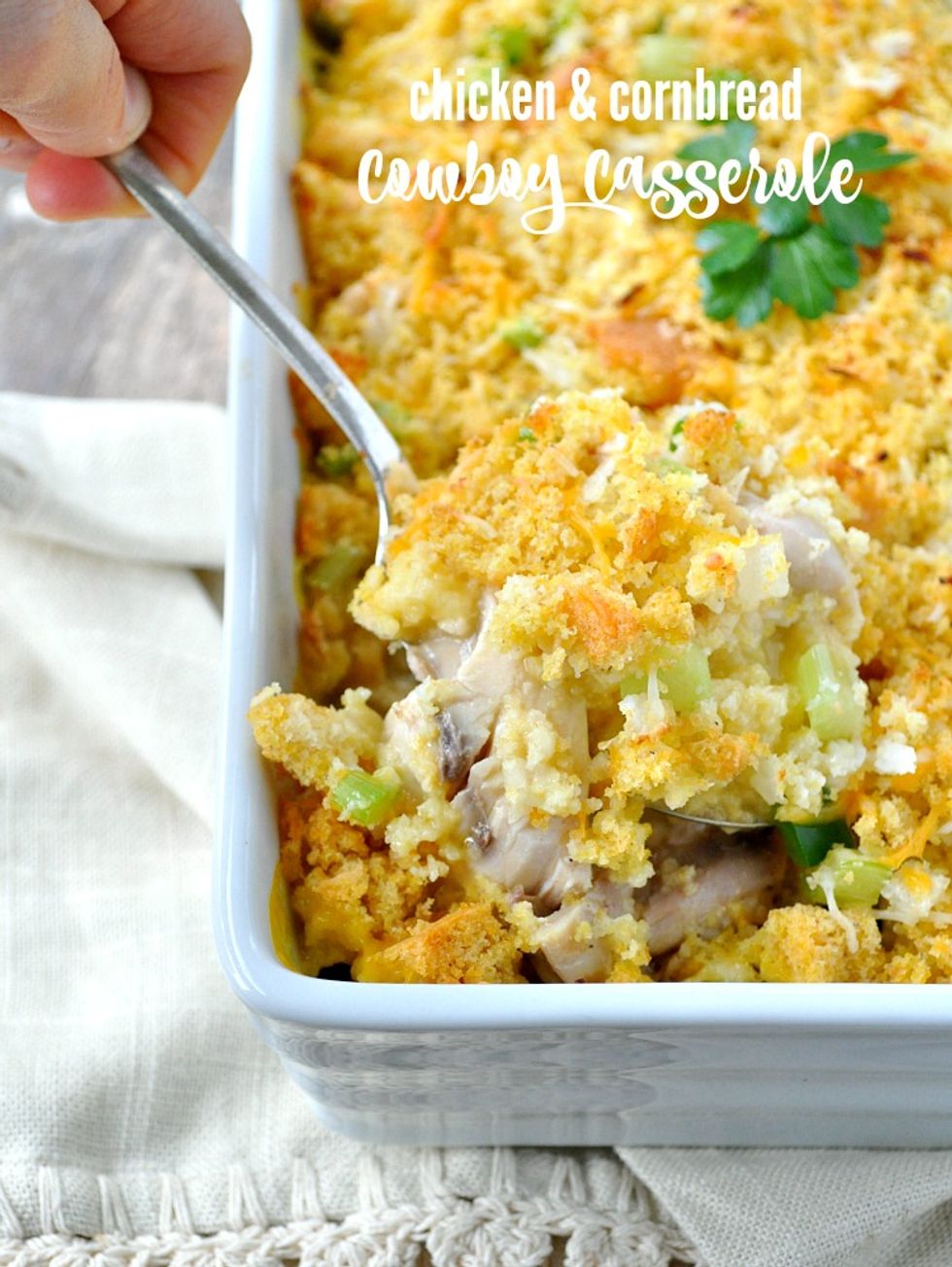 Satisfy your hungry family's appetites and warm their souls with this Cowboy Casserole with Cornbread and Chicken! Full of down-home ingredients, it's an easy one dish dinner that's perfect for potlucks, freezer meals, and weeknight suppers!
