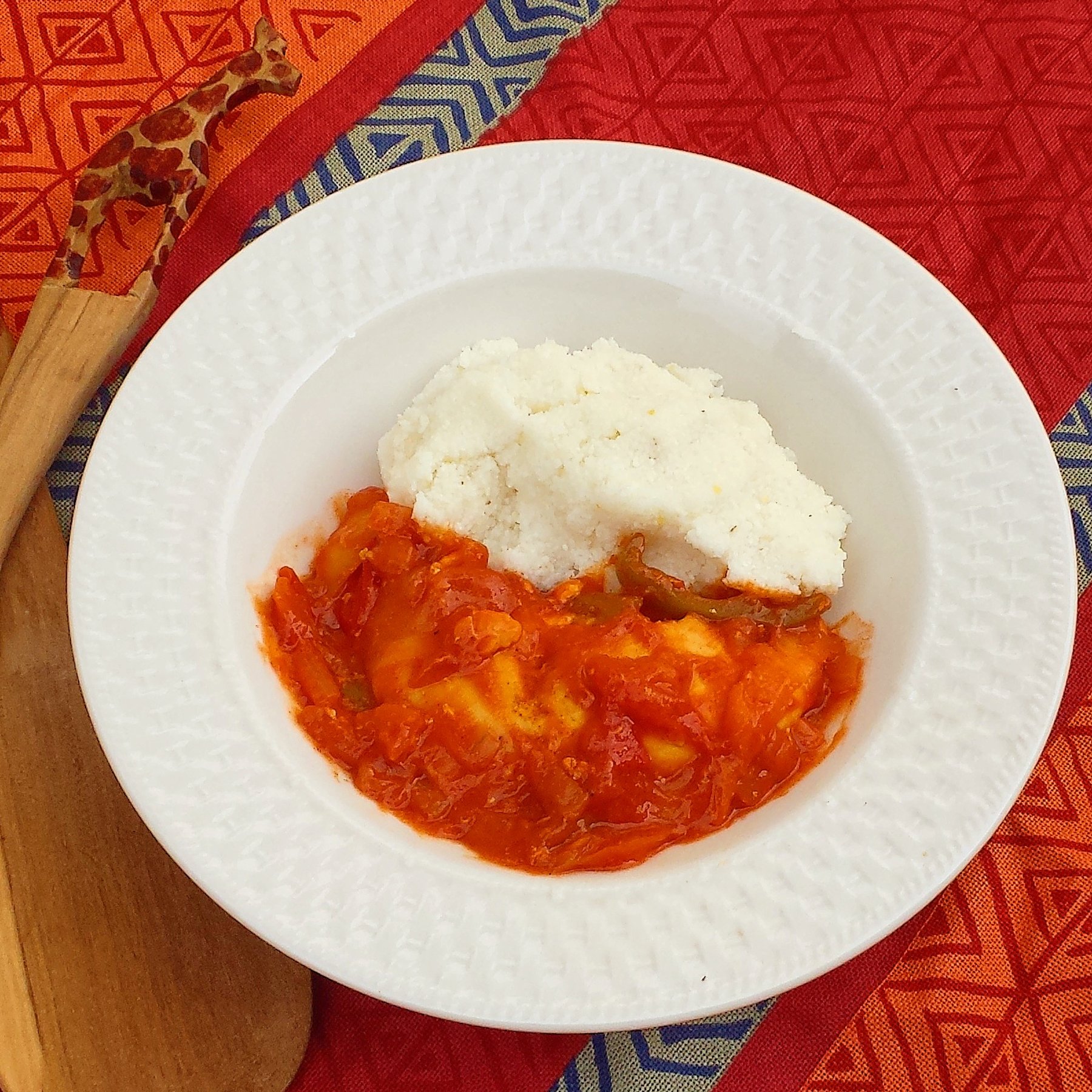 This South African dish includes maize meal, tomatoes, peppers, and chicken.