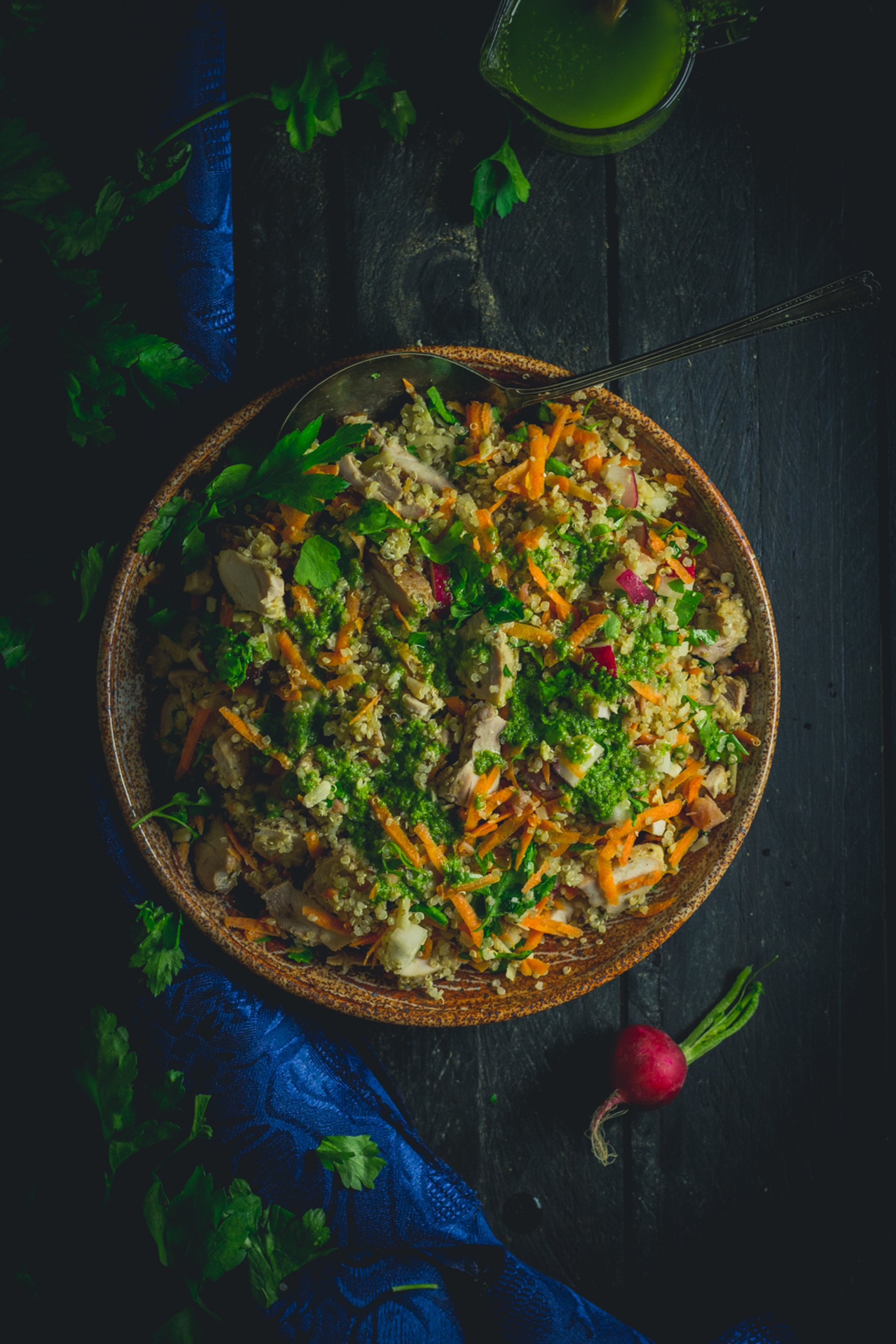 With warm shredded chicken, crispy bacon, & biting parmesan, this chicken quinoa salad is a hearty winter lunch that won't leave you hungry!