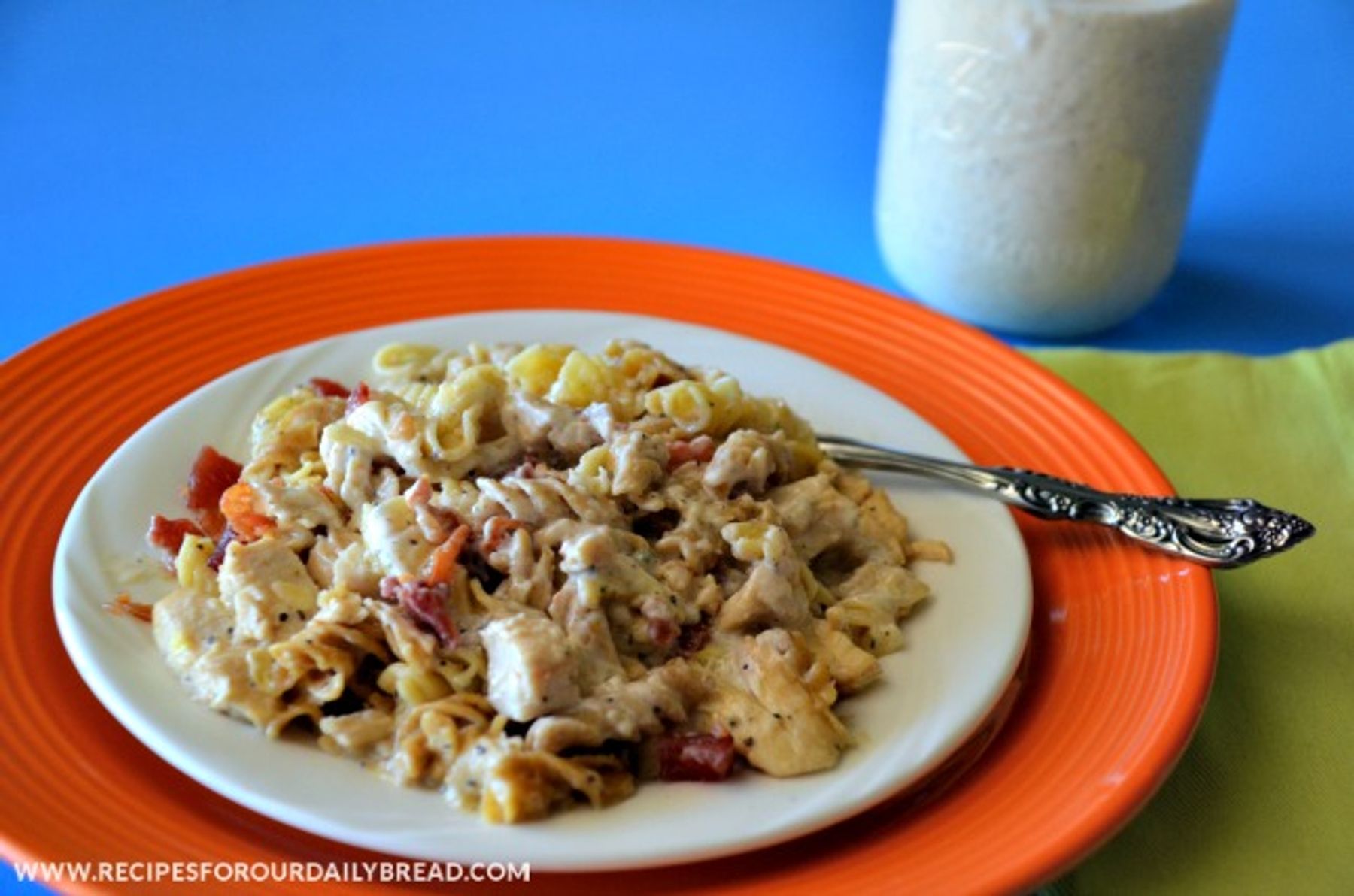 This Chicken Bacon Ranch Pasta Salad includes pasta, chicken, bacon, cheddar cheese, tomato, zucchini, and copycat OutBack Ranch Dressing.