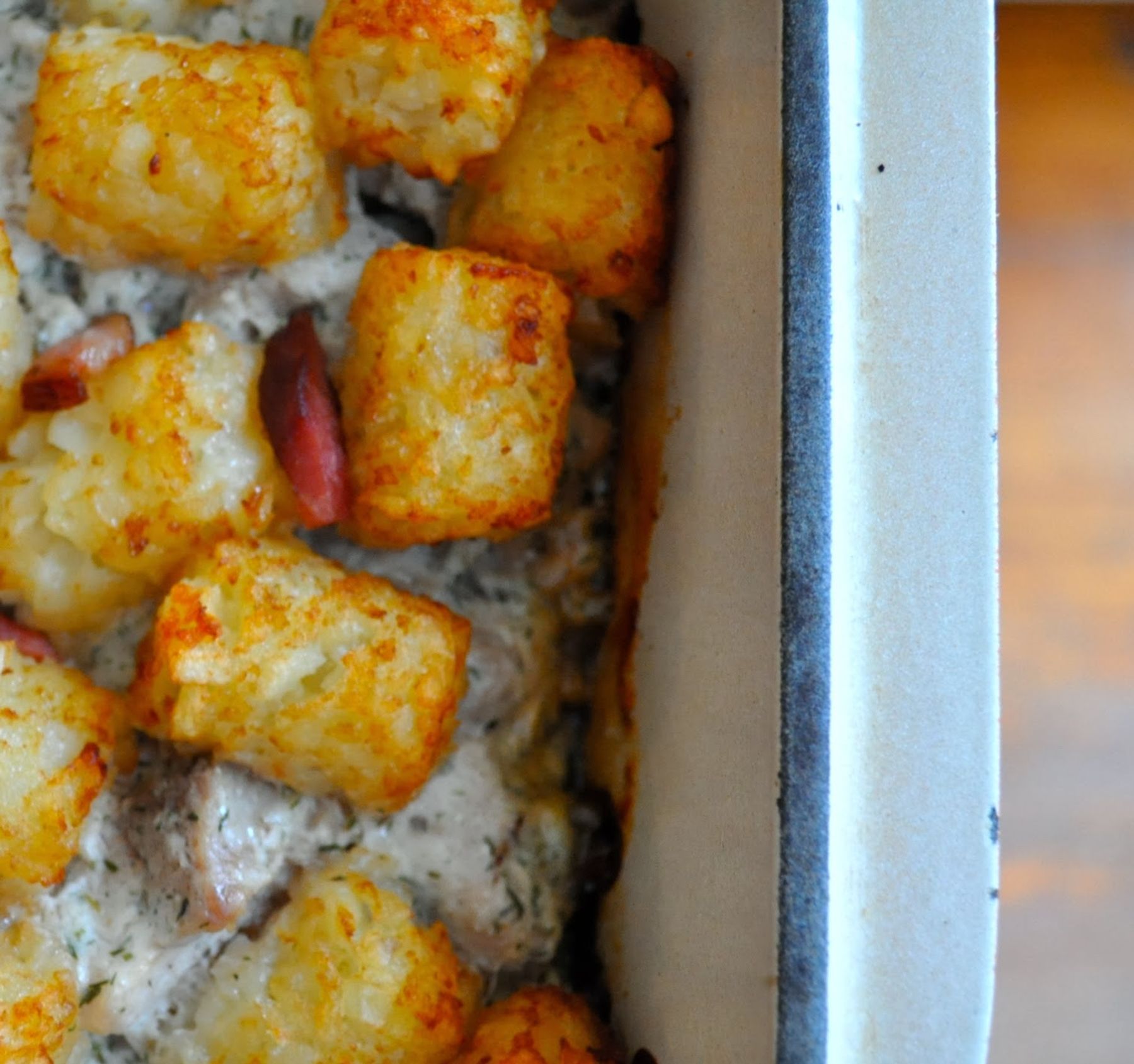 I love a good Tater Tot Casserole; hot warm comfort food in the middle of winter is just really hard to beat. Mix it up, cover tightly, bake, go play a game and dinner is mostly done.