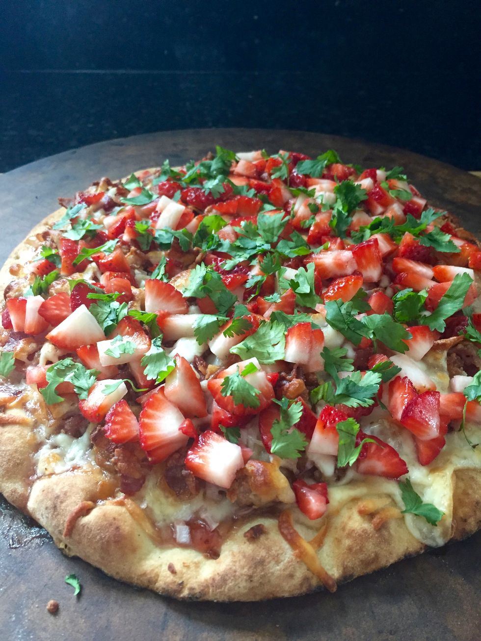 I have made the pizza so many times! It is soooo good! The sweetness of the berries, the heat from the Sriracha, the freshness from the bright cilantro and the deliciousness of the BACON! This is a perfect pizza to get you out of your Hawaiian Pizza routine!