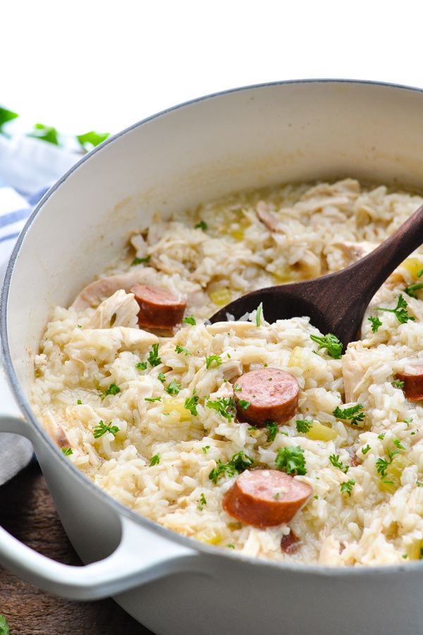 - Melt butter in a stockpot or large Dutch oven over medium-high heat. Add onion and celery and sauté until soft, about 10 minutes. Add chicken, sausage, seasoned salt, pepper, thyme, bay leaf and 8...
