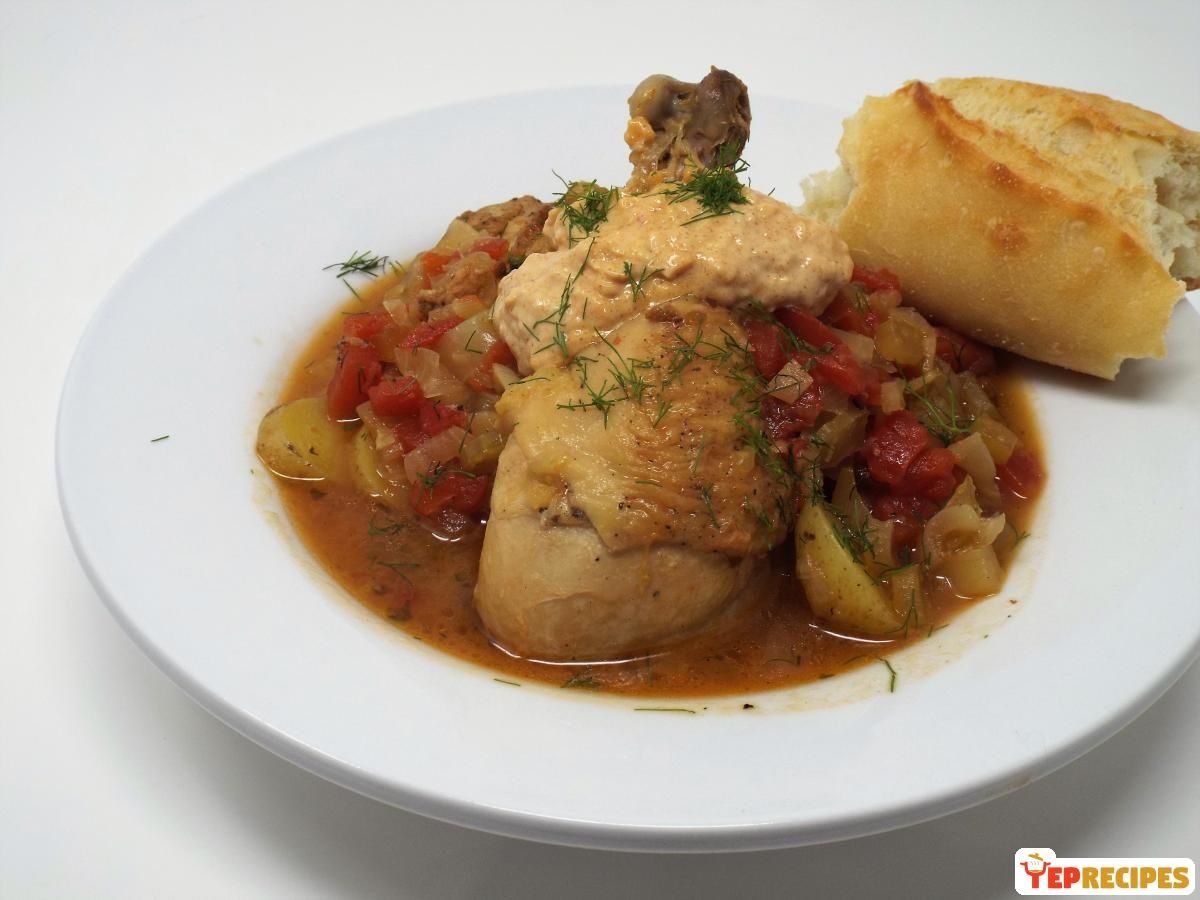 In the style of Provencal French. Chicken braised in the a rich tomato-fennel sauce, with baby potatoes, and topped with a garlicky-saffron cream.