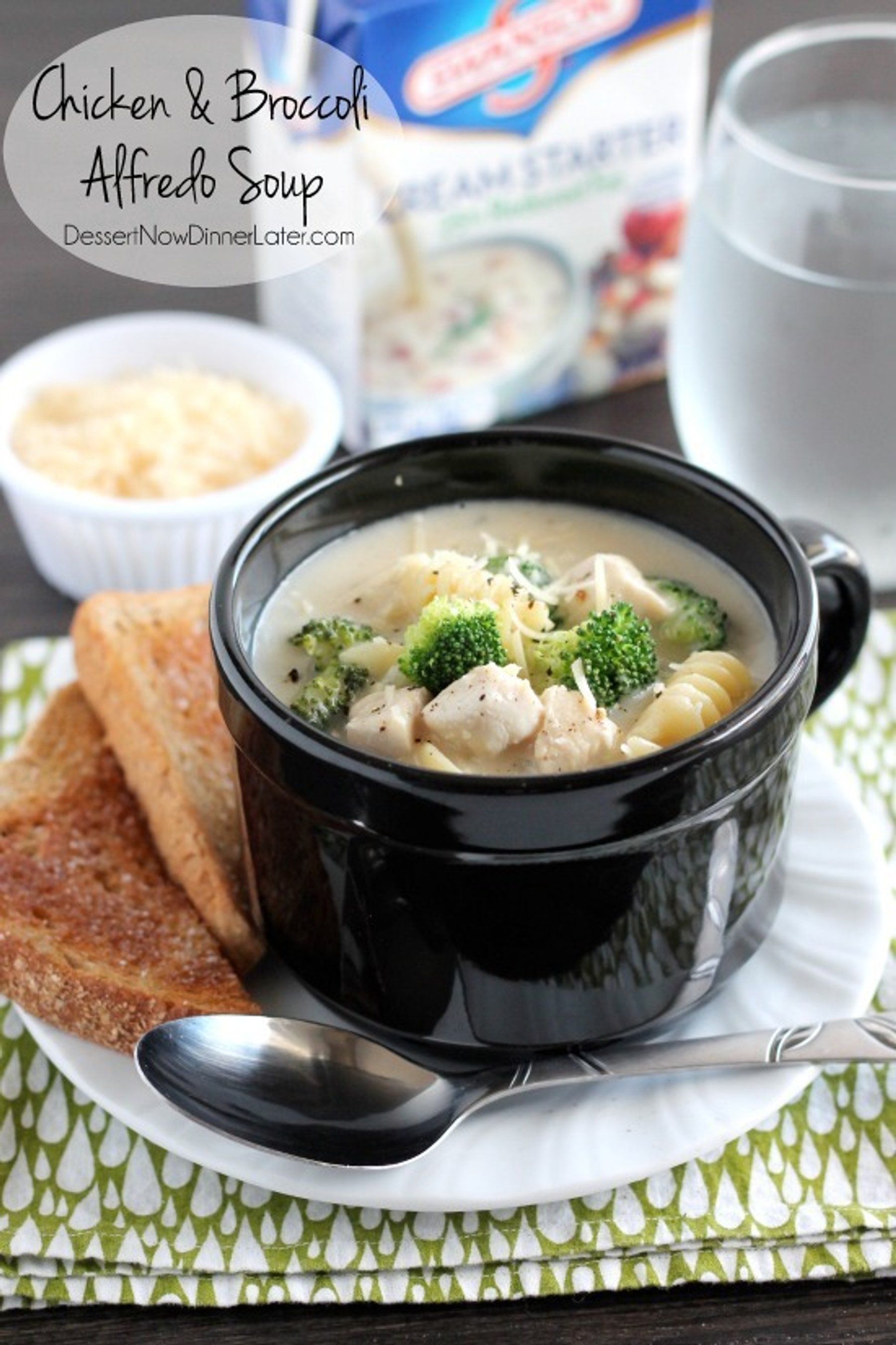 Chicken, broccoli florets, and noodles come together in this easy, creamy, garlic and parmesan alfredo broth to create Chicken and Broccoli Alfredo Soup!