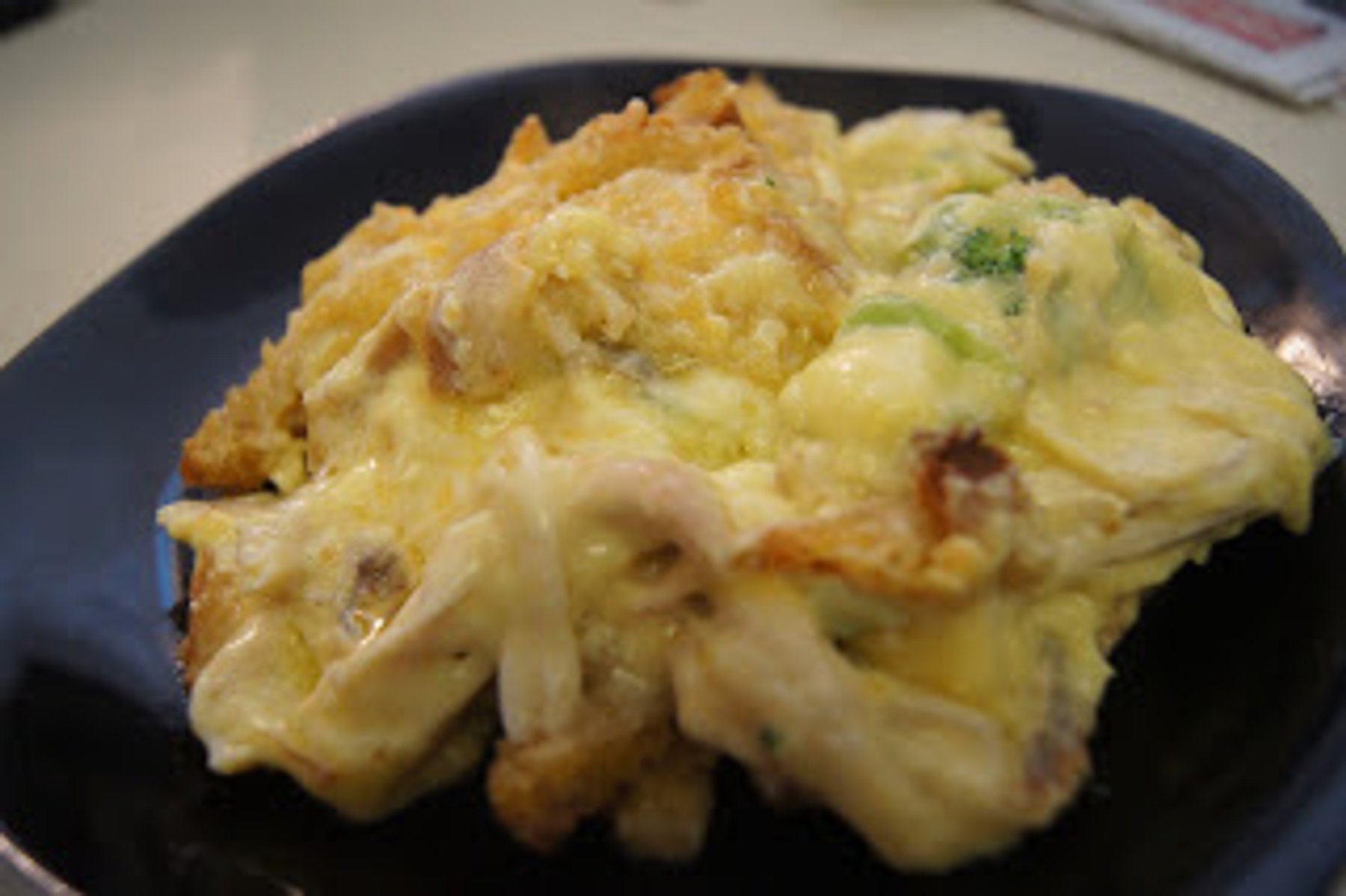1. Mix chicken, broccoli, cream of chicken soup, 1 cup cheese and sour cream into a bowl. Mix well