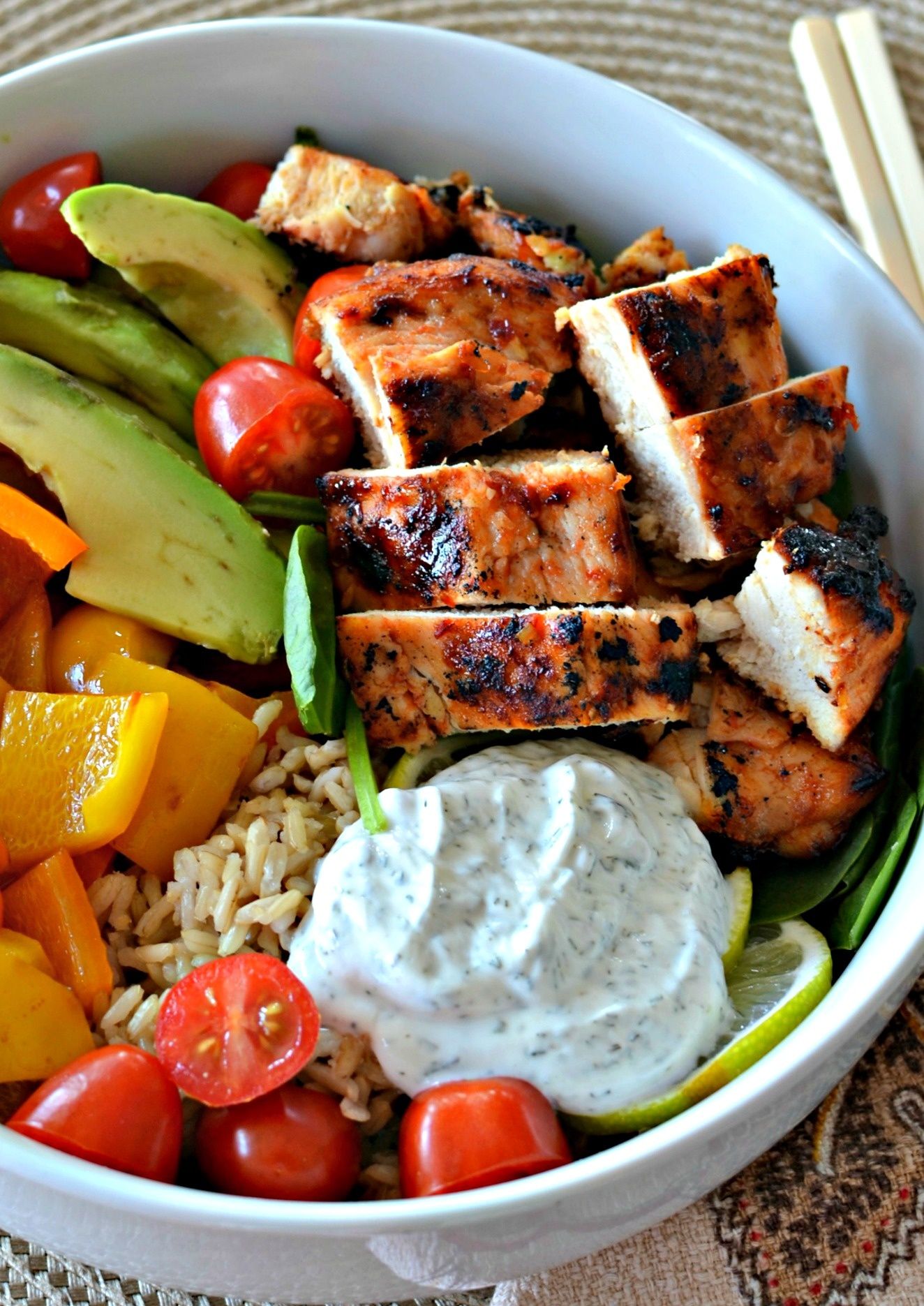 This delicious healthy Chicken Buddha Bowl combines Thai grilled chicken, spinach, brown rice, bell peppers, tomatoes and avocado with a simple Greek yogurt dressing. This easy to make recipe brings wholesome food together in a colorful tasty display. There are no artificial ingredients or preservatives in this Chicken Buddha Bowl.