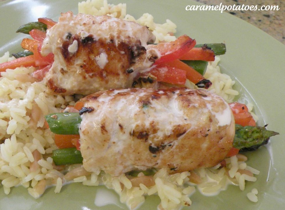 These litte bundles taste amazing and look wonderful. Chicken filled with asparagus, peppers, and carrots {in their own cute little package . . .} topped off with a Rosemary Cream Sauce – what’s not to love?