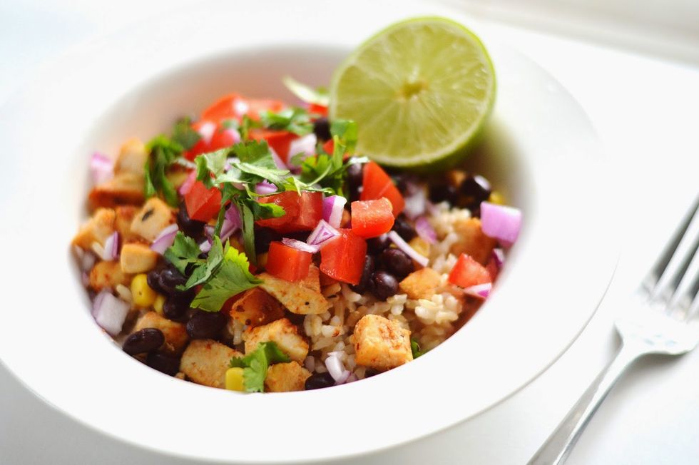 Heat coconut oil over medium heat in a medium skillet. Add diced chicken and toss in seasoning. Cook chicken until done throughout, about 7-10 minutes. Meanwhile, dice and drain all the veggies and beans...
