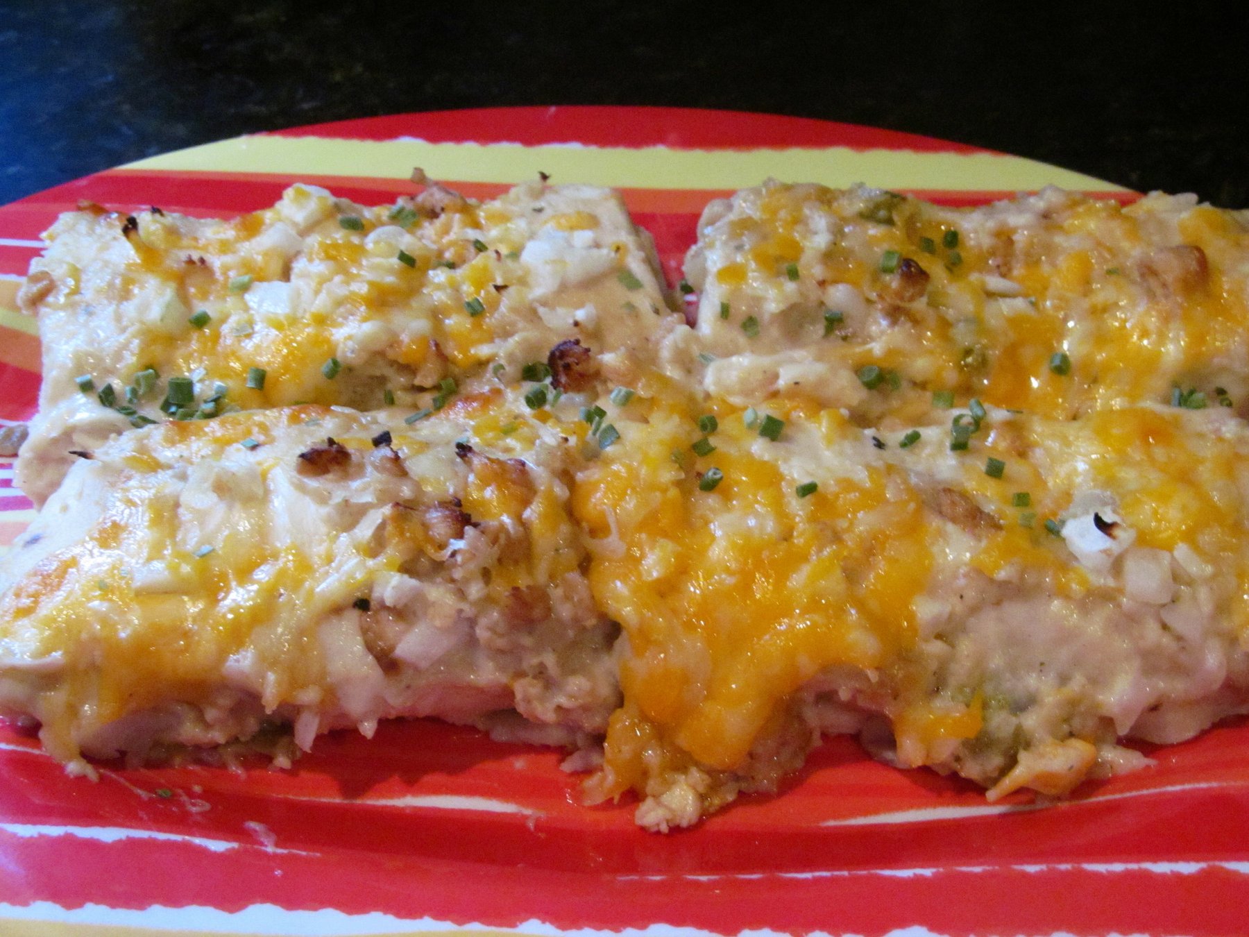 melt butter and garlic in large sauce pan on low heat; add flour to coat; add chicken broth and water until thickened; add sour cream and green chillies;reduce heat to low; place 2 tb of each in tortilla;...