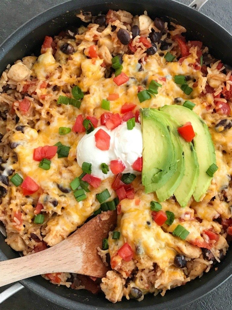 This easy chicken burrito skillet cooks in one pan on the stove top. Your favorite burrito ingredients are cooked up in one skillet pan. Tender chunked chicken, cheese, rice, beans, and seasonings simmer and cook to perfection in 30 minutes!
