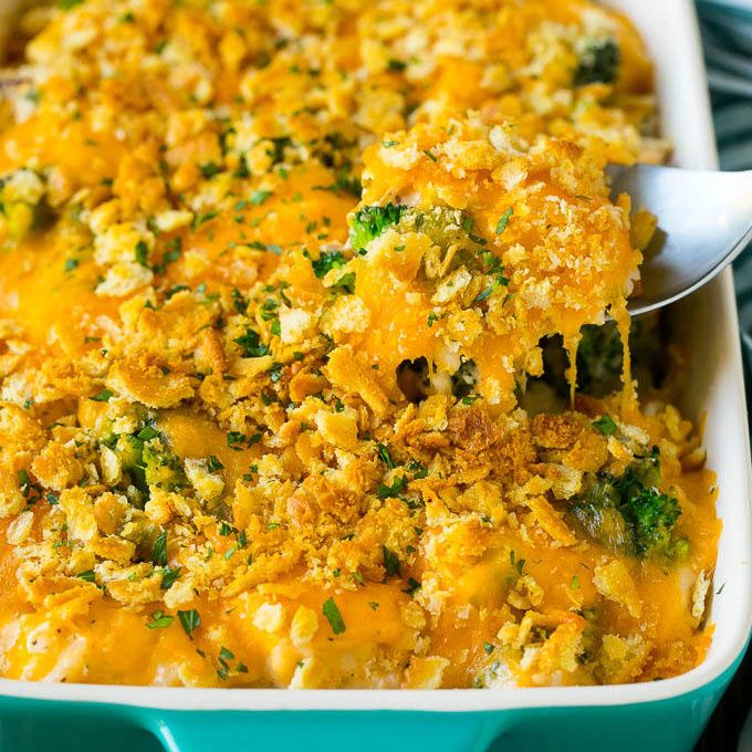 This chicken casserole is a blend of cooked chicken, rice and broccoli, all tossed together in a creamy cheese sauce then baked to perfection. A hearty meal that's family friendly and easy to make!