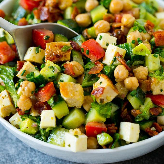 This chopped salad is a mix of grilled chicken, tomatoes, cucumbers, bacon, chickpeas and fresh mozzarella cheese, all tossed together in a homemade vinaigrette. A delicious blend of flavors and textures that makes for the perfect lighter meal.