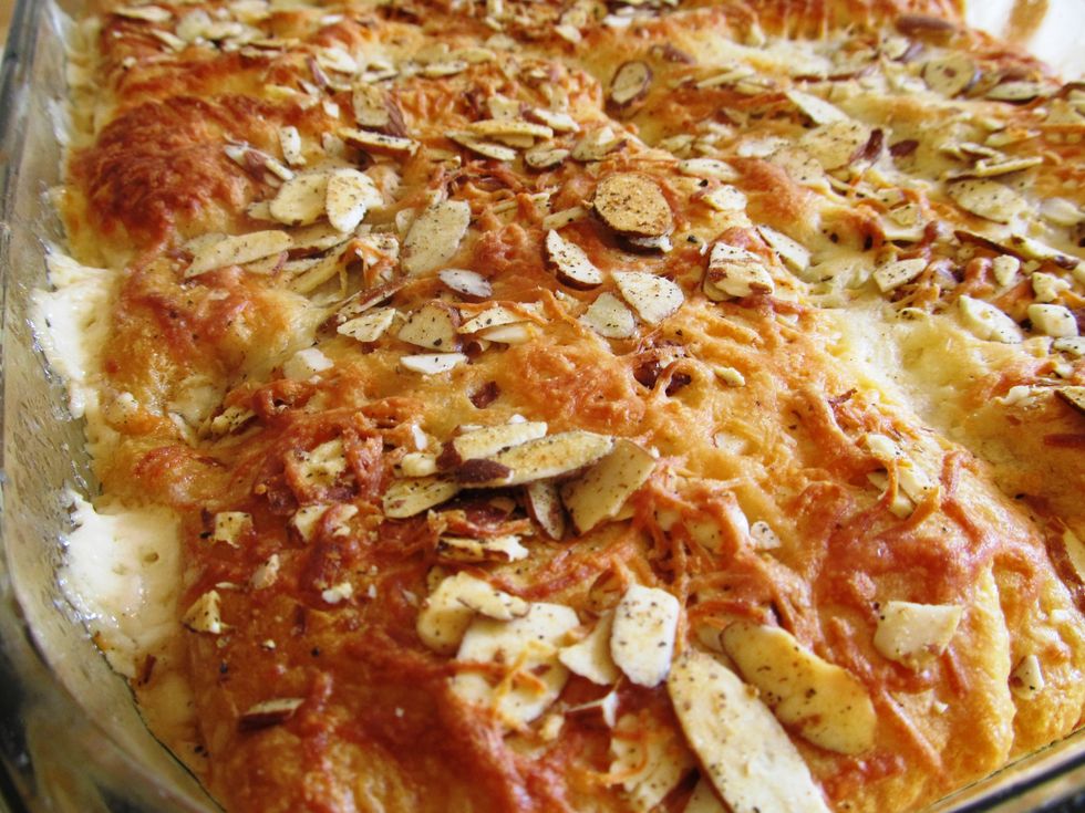 A delicious chicken mixture topped with flaky crescent dough and almond/cheesy goodness. Warms up nicely for left overs!