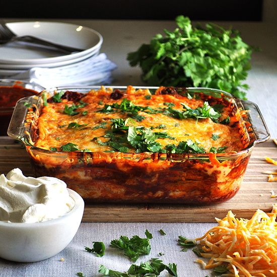 Layers of corn tortillas, cheese, roasted chicken, and red enchilada sauce makes a simple, hearty meal. Get the recipe: alittleandalot.com