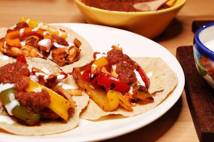 Chicken fajitas rubbed with our favorite fajita seasoning, a blend of guajillo peppers, arból peppers, coriander seeds, paprika, sugar, garlic powder, onion powder, cumin, black pepper, and Mexican oregano.