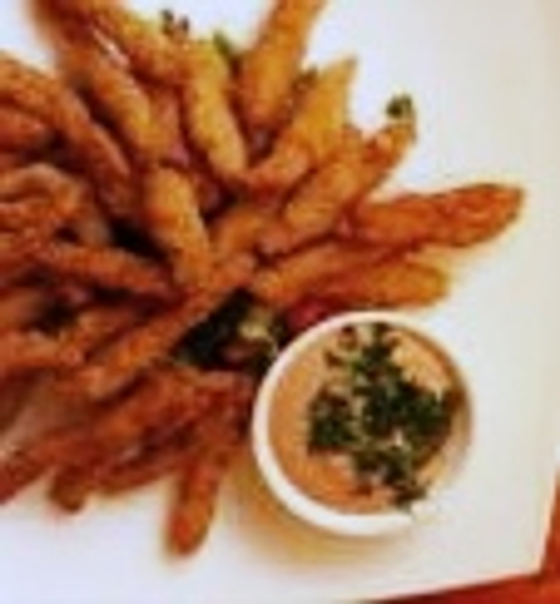 Marinate chicken strips in lemon juice and salt. Coat chicken strips with
