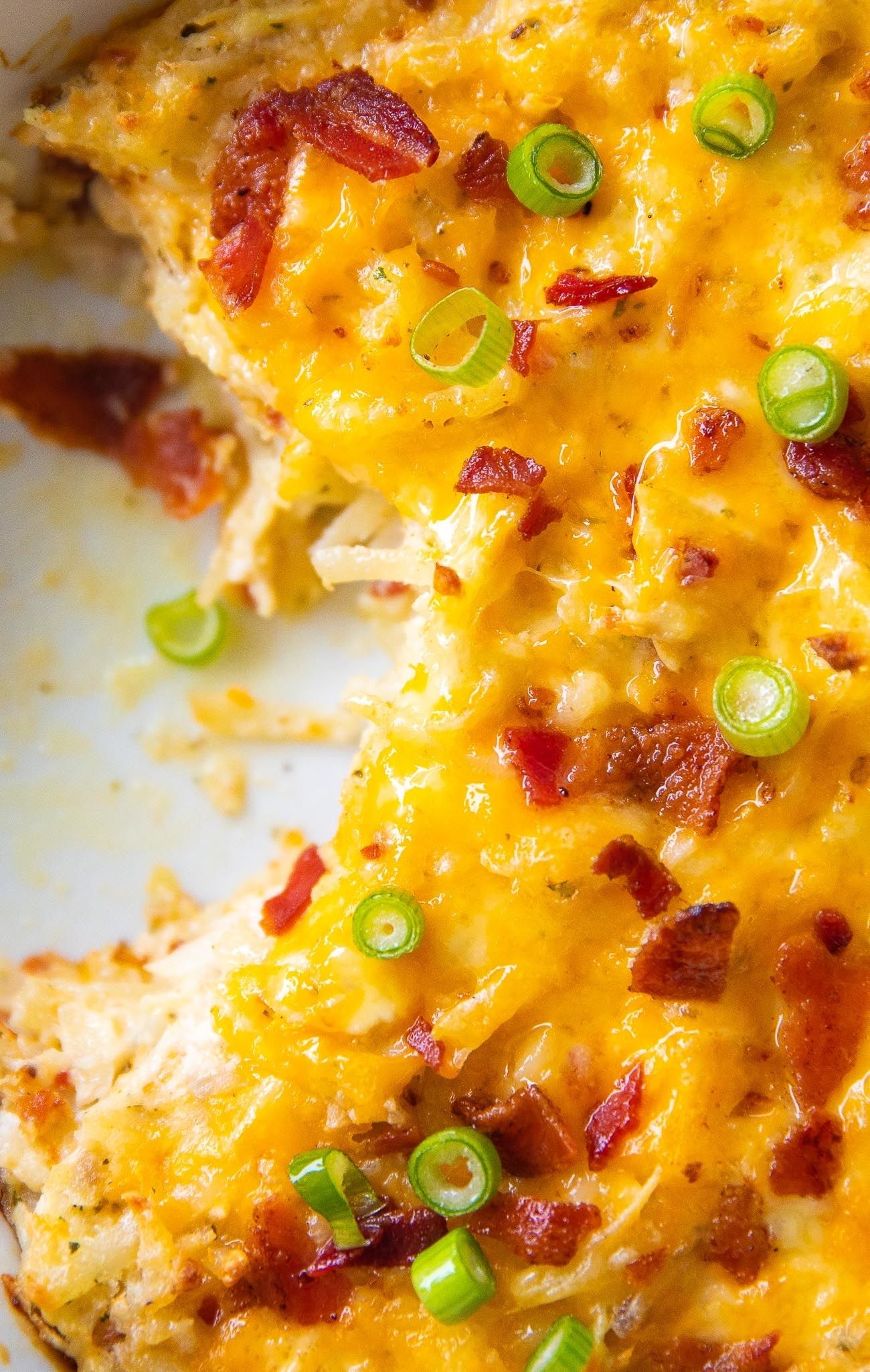 My all-in-one chicken hash brown casserole is an easy family dinner or quick covered dish recipe. This loaded hash brown bake is made with tender chicken, hash browns, cream cheese, sour cream, yummy cheese and crispy bacon.