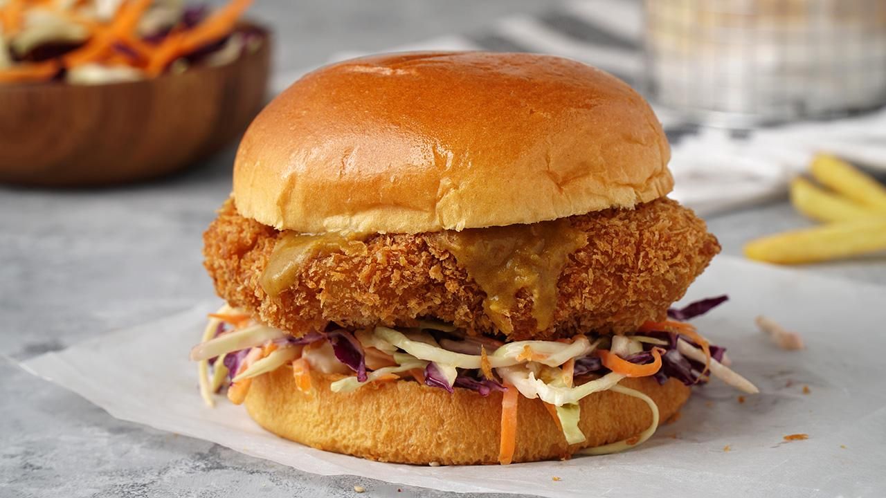 Chicken Katsu Curry Burger khinskitchenSeptember 21, 2021 54 Chicken Katsu Curry Burger Recipe – succulent chicken breast with crispy panko coating, crisp cabbage salad, topped with katsu curry gravy, and Shichimi chilli powder.4Try itSee the full directions on my site