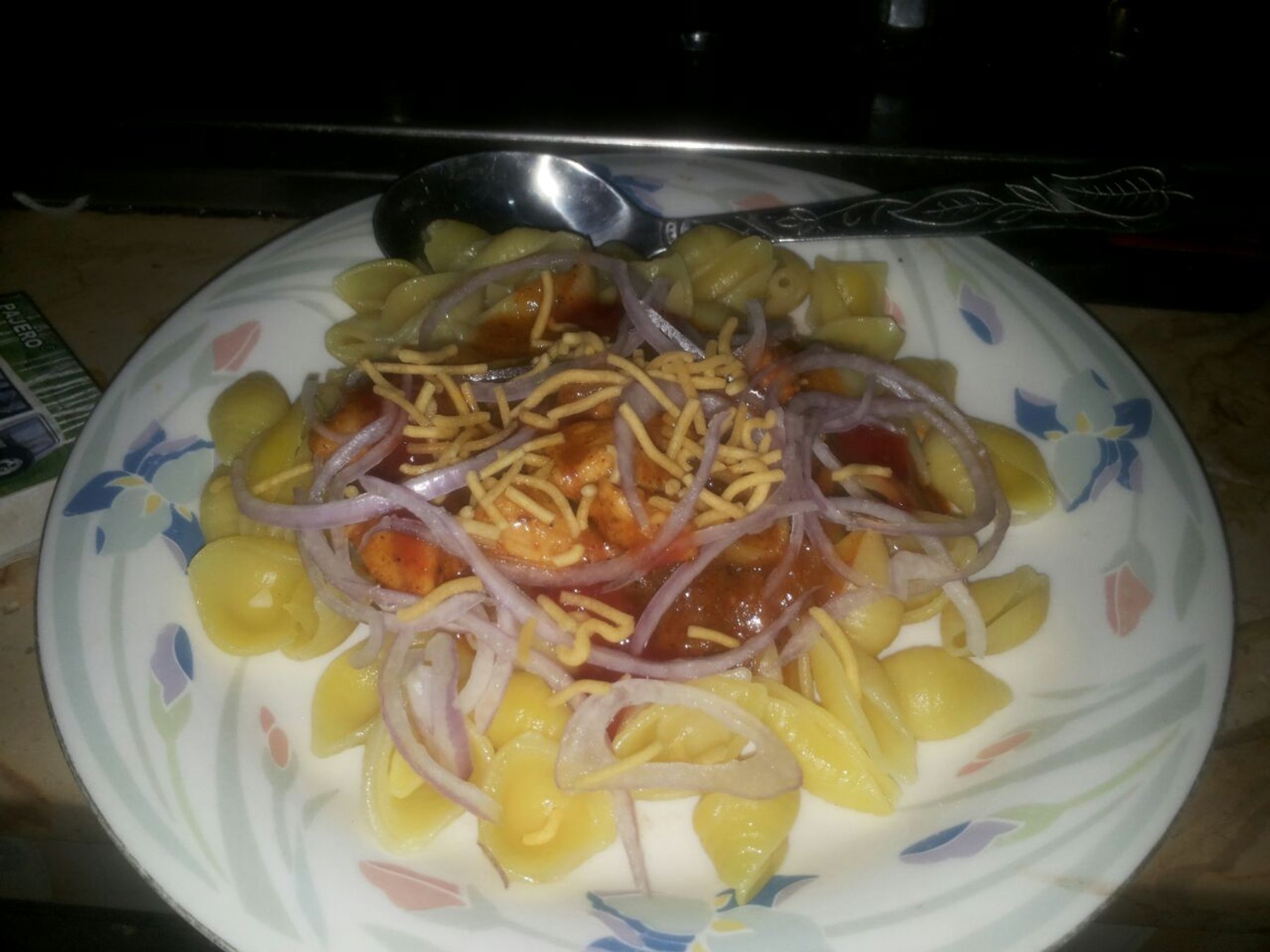 Heat oil add chicken, salt, ginger garlic paste and red chili powder. Cook for five minutes, then add tamarind paste and cover the lid and simmer for five to seven more minutes. Pour your chicken over macaroni and garnish with onion. Lovely chicken macaroni chat is ready.
