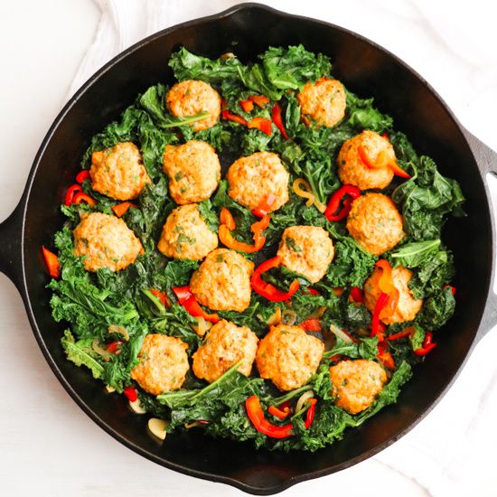 A creamy roasted red pepper feta cheese sauce drizzled (or poured in copious amounts) over perfectly cooked, bursting with flavor, chicken meatballs, and sauteed kale. This dish is everything that real food is about, whole ingredients bursting with flavor and color.