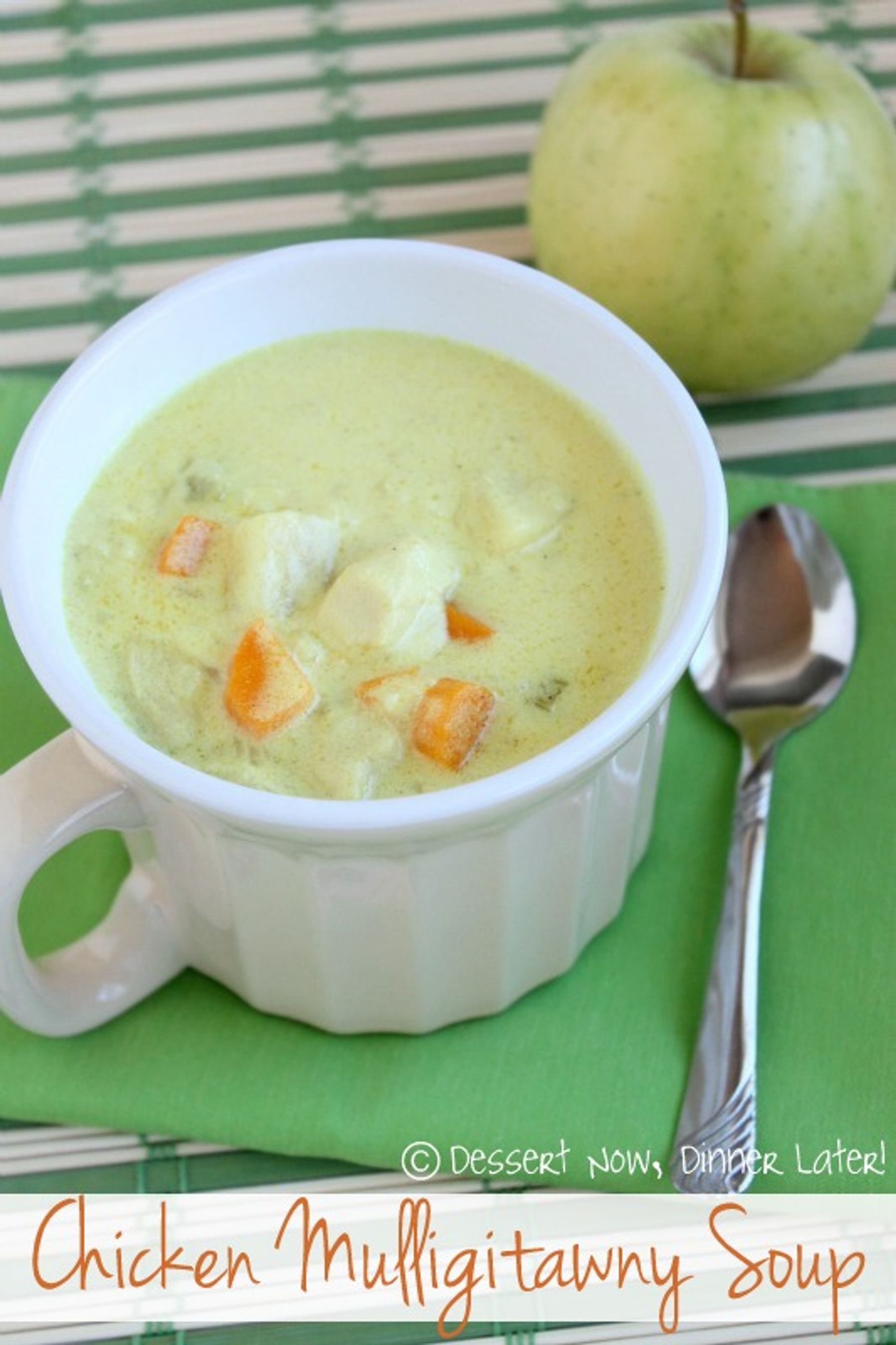 An Indian inspired chicken, rice & curry soup that uses apples for a sweet addition to a delicious soup.