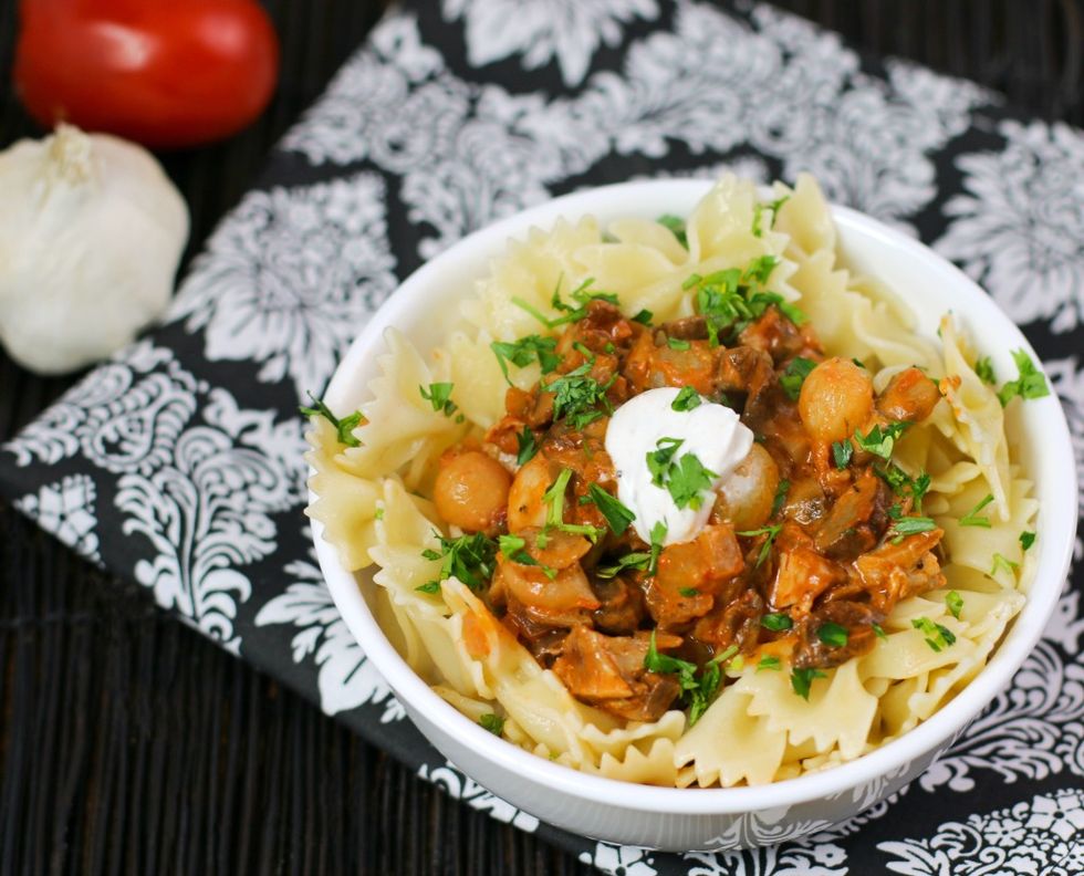 Quick Chicken Mushroom Bourguignon with pasta, bacon, pearl onions and tomato-simmered mushrooms is a rich, hearty meal you’ll love!