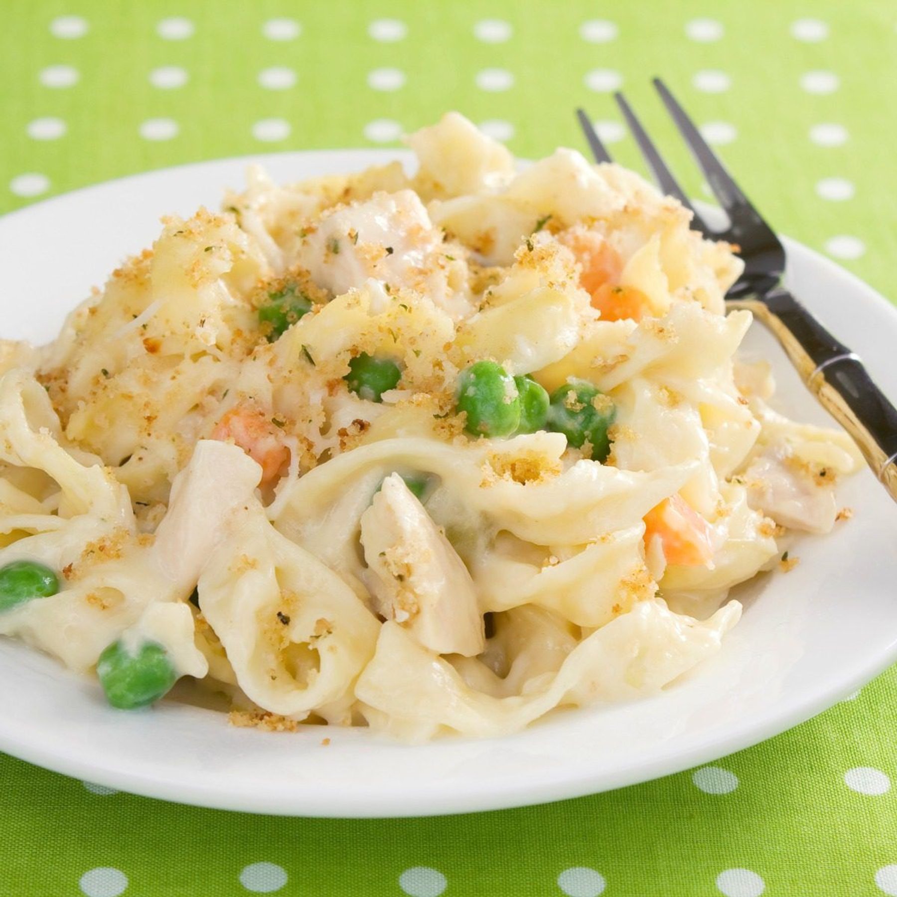 This chicken noodle casserole has the flavor of chicken alfredo but feels more casual. It's a perfect family dinner or potluck dish!