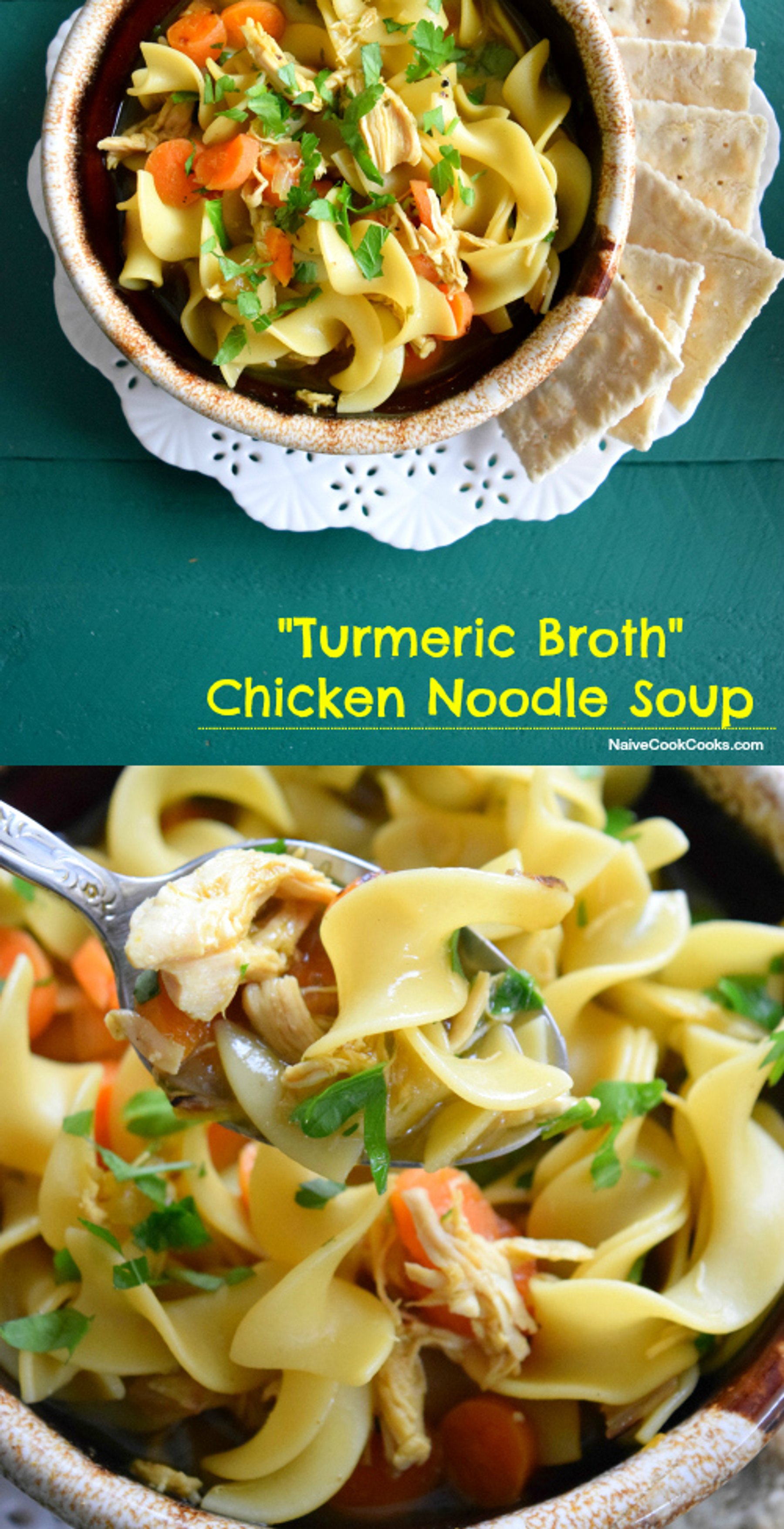 Chicken Noodle Soup In Turmeric Broth Amishi GadodiaApril 16, 2015 30 Classic chicken noodle soup in immunity boosting turmeric broth! So delicious that you won’t have any leftovers.