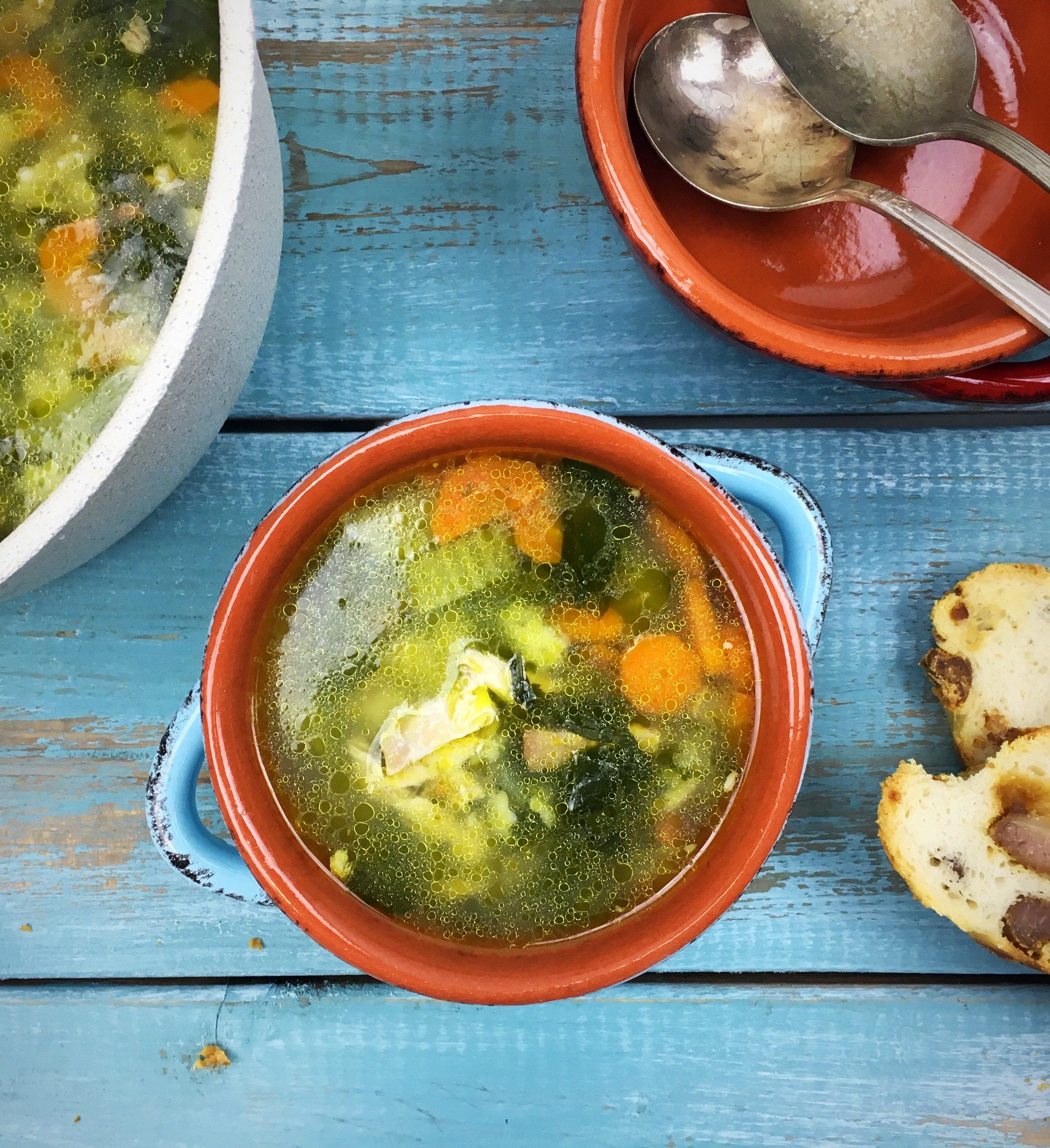 Favourite family recipe. Chicken broth made from scratch with a loaded plate of well combined vegetables.