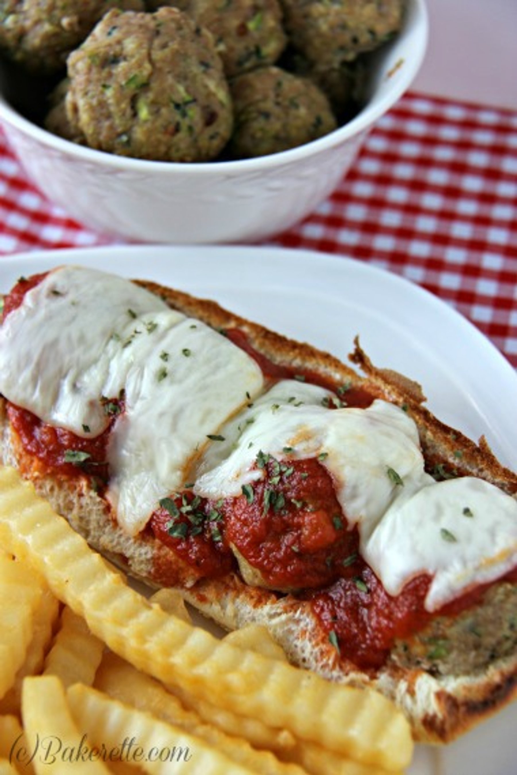 These chicken Parmesan meatball subs are the easiest things to make on the planet and will take only half-an-hour to make…or less depending on how fast you are at shredding zucchini. :) I realize I’ve been on an Italian kick. I mean, I’ve made Pepperoni Pizza Pasta, Manicotti, Baked Zucchini Parmesan Crisps, French Bread (even though it says “French” it’s perfectly Italian), Italian Pasta Salad, and more. You’d think I was half Italian or something. Far from it. Just love the stuff.