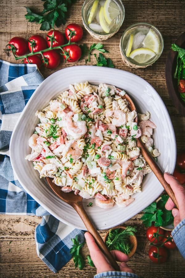 Full of simple and fresh ingredients, this chicken pasta salad with shrimp and pepperoni is the perfect side dish for your next cookout, an easy option for a light weeknight dinner, or a refreshing make-ahead lunch. You'll love the flavorful combination of onions, bell peppers, celery, peas, pecans, herbs, and a creamy mayo dressing. Serve the cold pasta salad with mixed greens, focaccia, garlic bread, breadsticks, or a crusty baguette!
