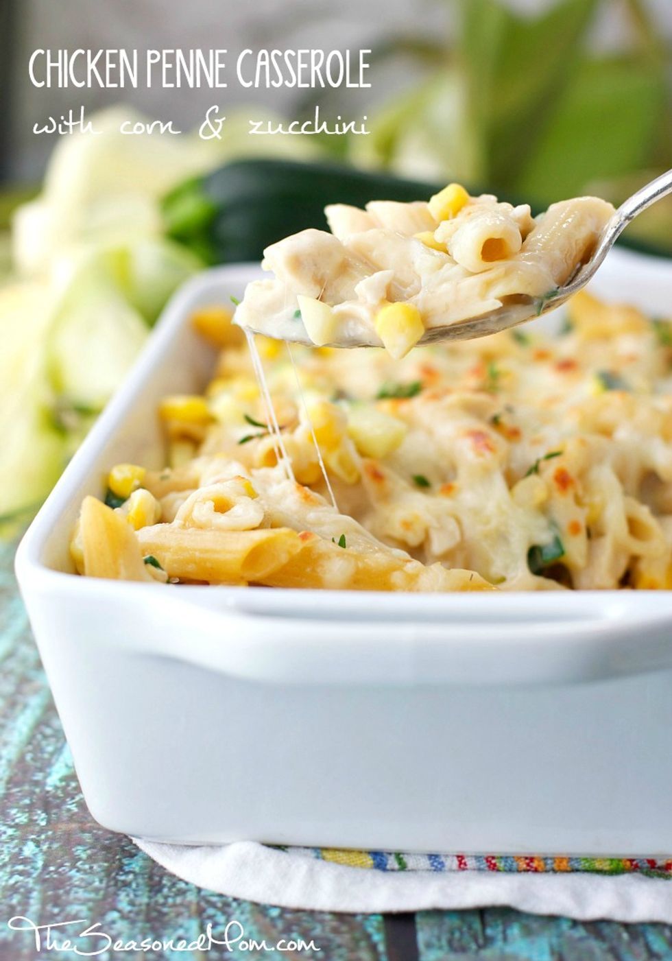 This healthy Chicken Penne Casserole with Corn and Zucchini is oozing with melted cheese and a smooth, creamy sauce! It’s the perfect clean eating dinner to showcase some of summer’s best produce!