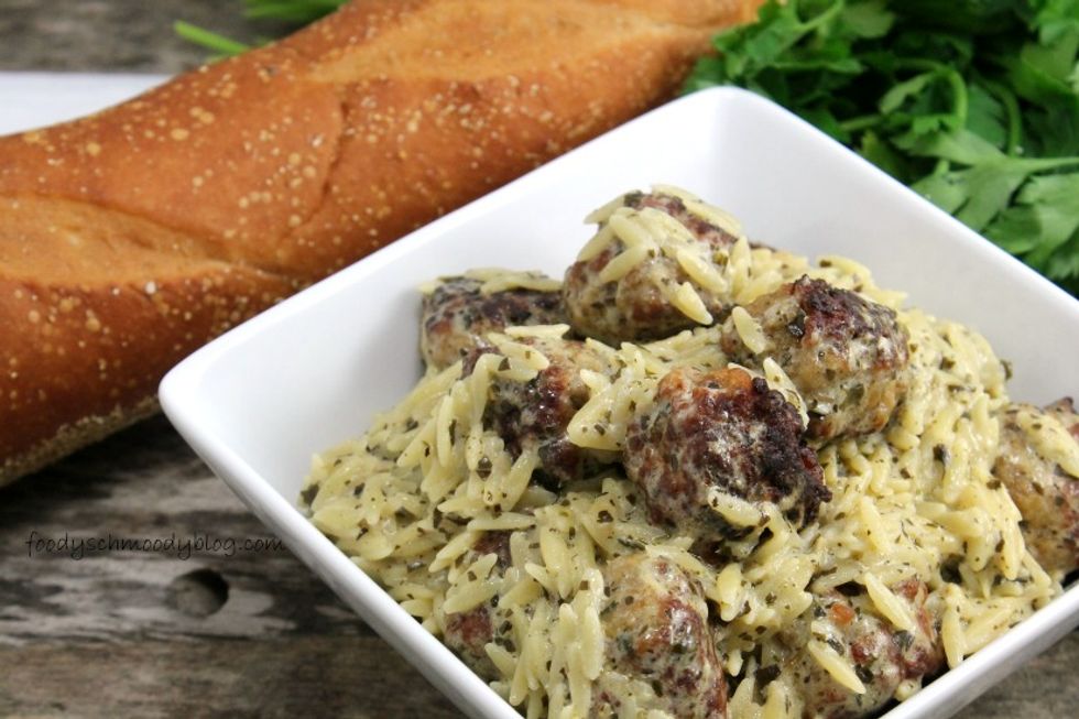 Pesto infused creamy orzo is topped with lean chicken meatballs seasoned with pesto