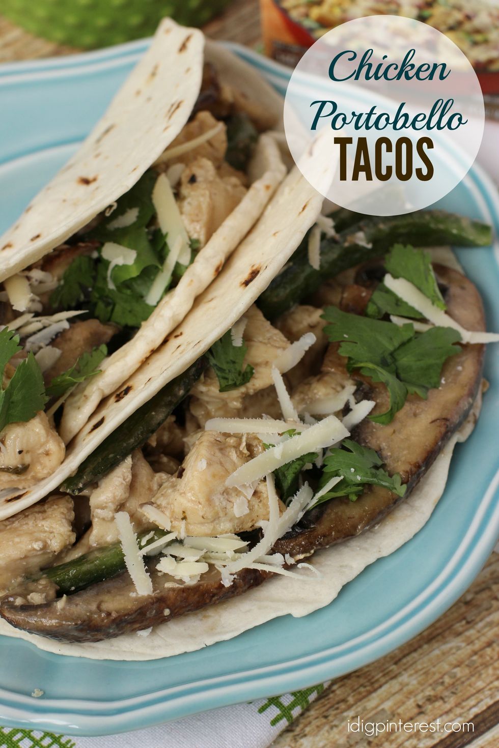 2 large portobello mushroom heads, sliced 1 large poblano pepper, sliced 2 large chicken breasts (or equivalent of 2 heaping cups when cooked), diced Olive Oil 1 clove garlic, minced 1/2 cup Campbell's Soups for Easy Cooking Savory Portobello Mushroom Soup Chopped cilantro, shredded cheese, and sour cream for garnish