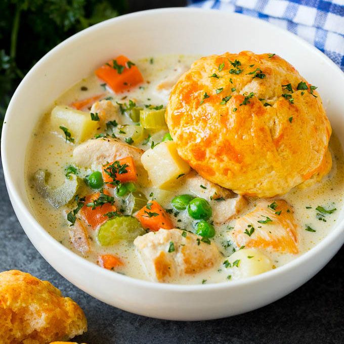 This chicken pot pie soup is a creamy soup loaded with tender chicken, potatoes and vegetables, then topped with homemade cheddar biscuits. A comfort food classic that's perfect for a cold night.
