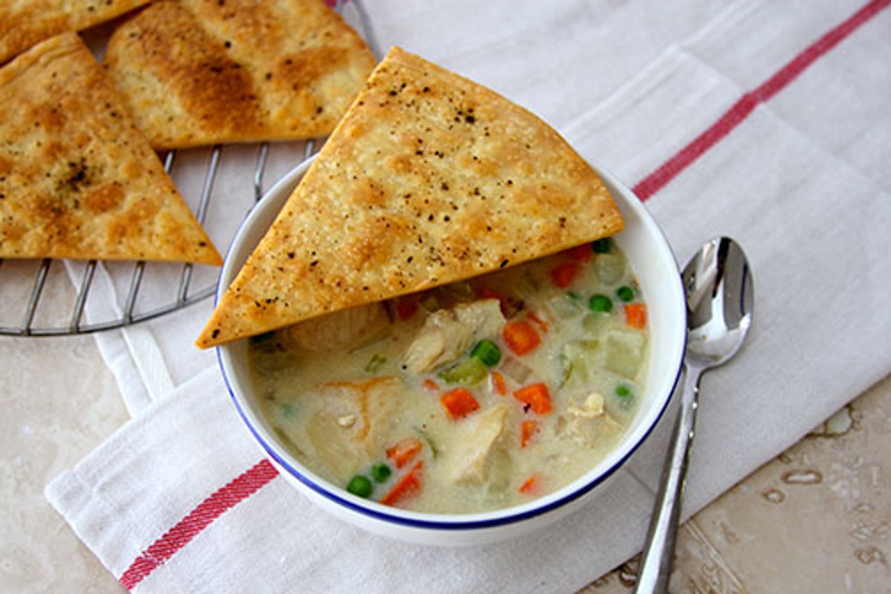 Preheat oven to 425 degrees. Unroll pie crust onto a baking sheet and sprinkle with pepper and a pinch of poultry seasoning; cut into 6 triangles. Bake until puffed and golden about 10 minutes. In a...