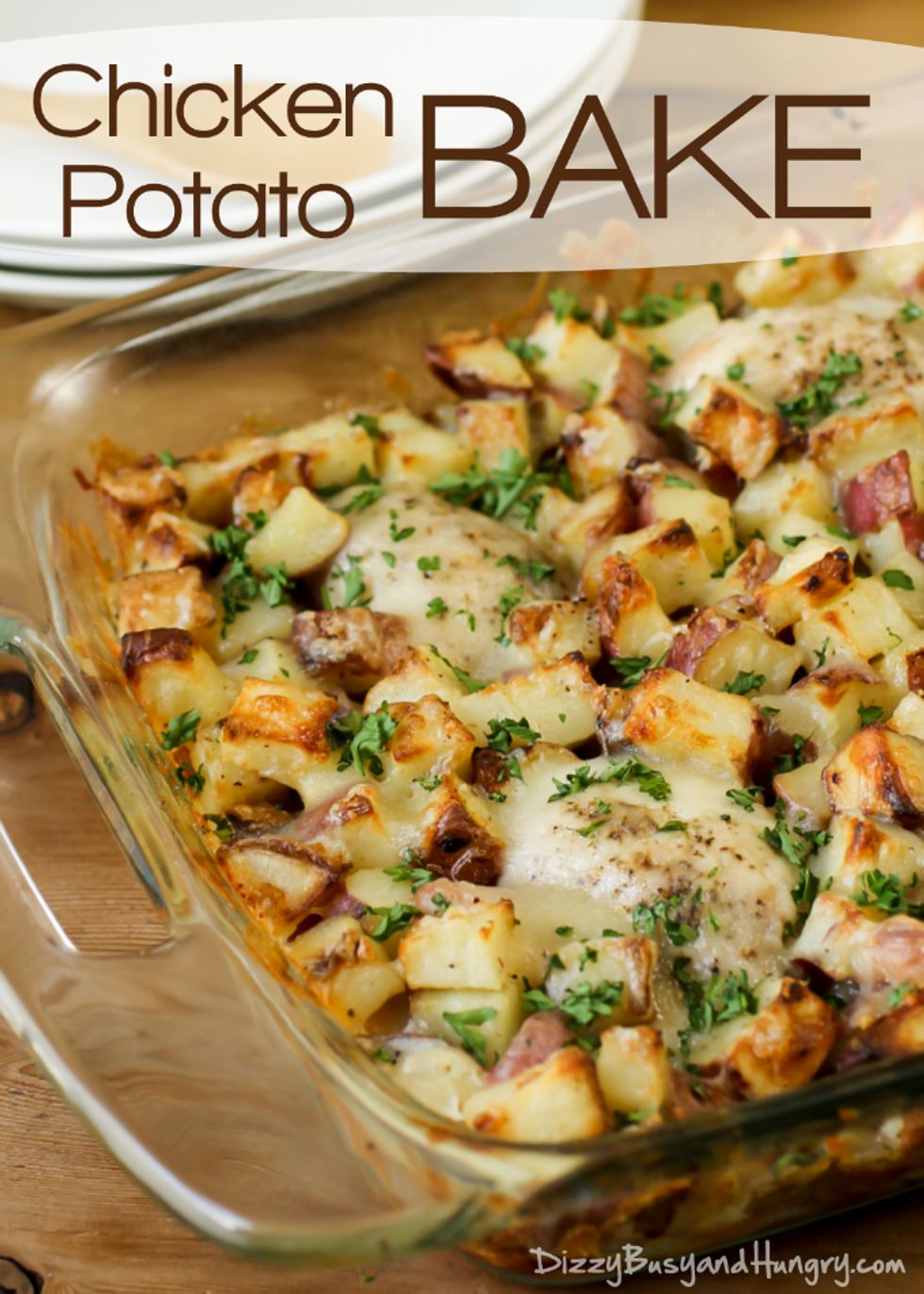 Potatoes tossed in garlic and olive oil and baked to a golden brown with tender, juicy chicken thighs. A family favorite!