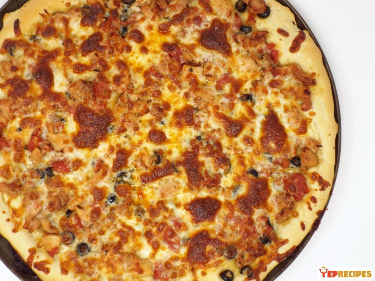 Chicken, tomato, olives, and capers spread on a homemade pizza crust and topped with mozzarella cheese.