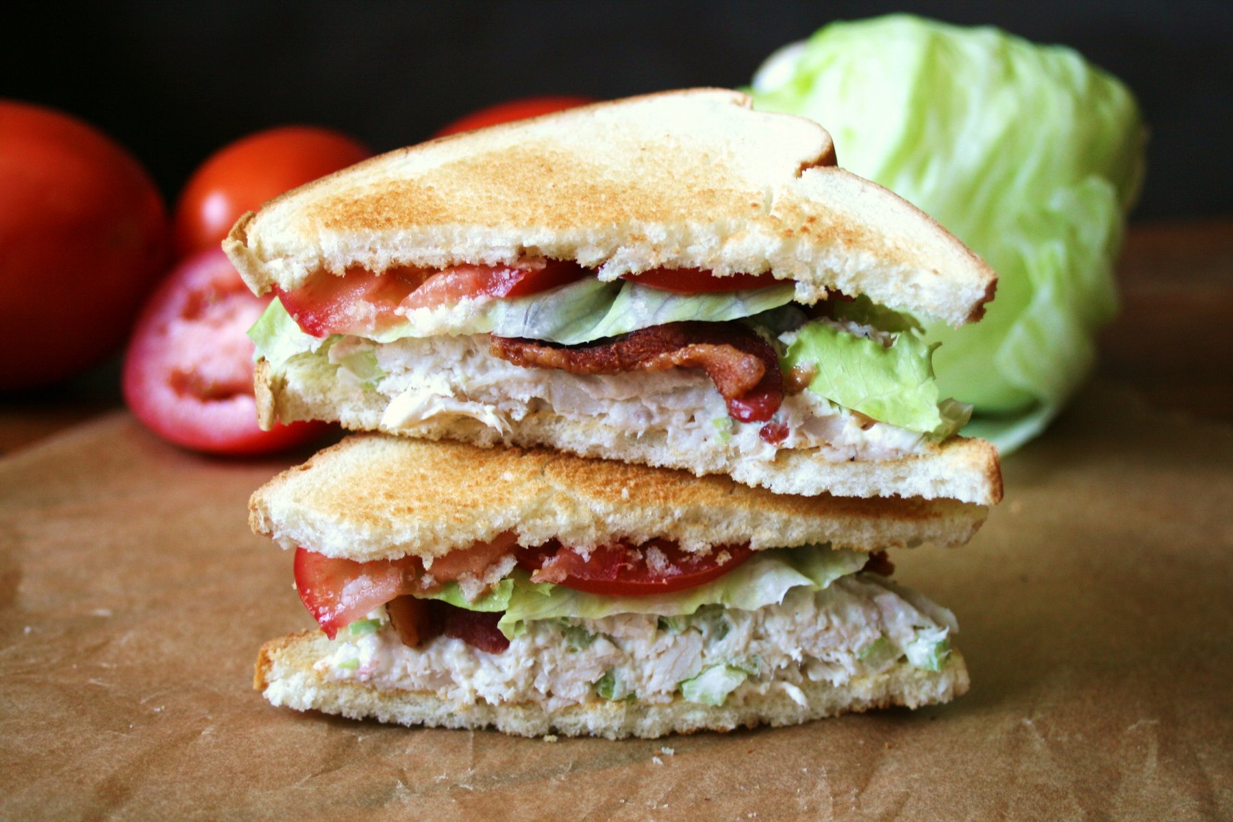 Add the chicken, mayo, salt, pepper, sugar, mustard, celery, and onion to a bowl. Mix well. Lay out toast, spread chicken salad, and layer the tomatoes, bacon and lettuce.
