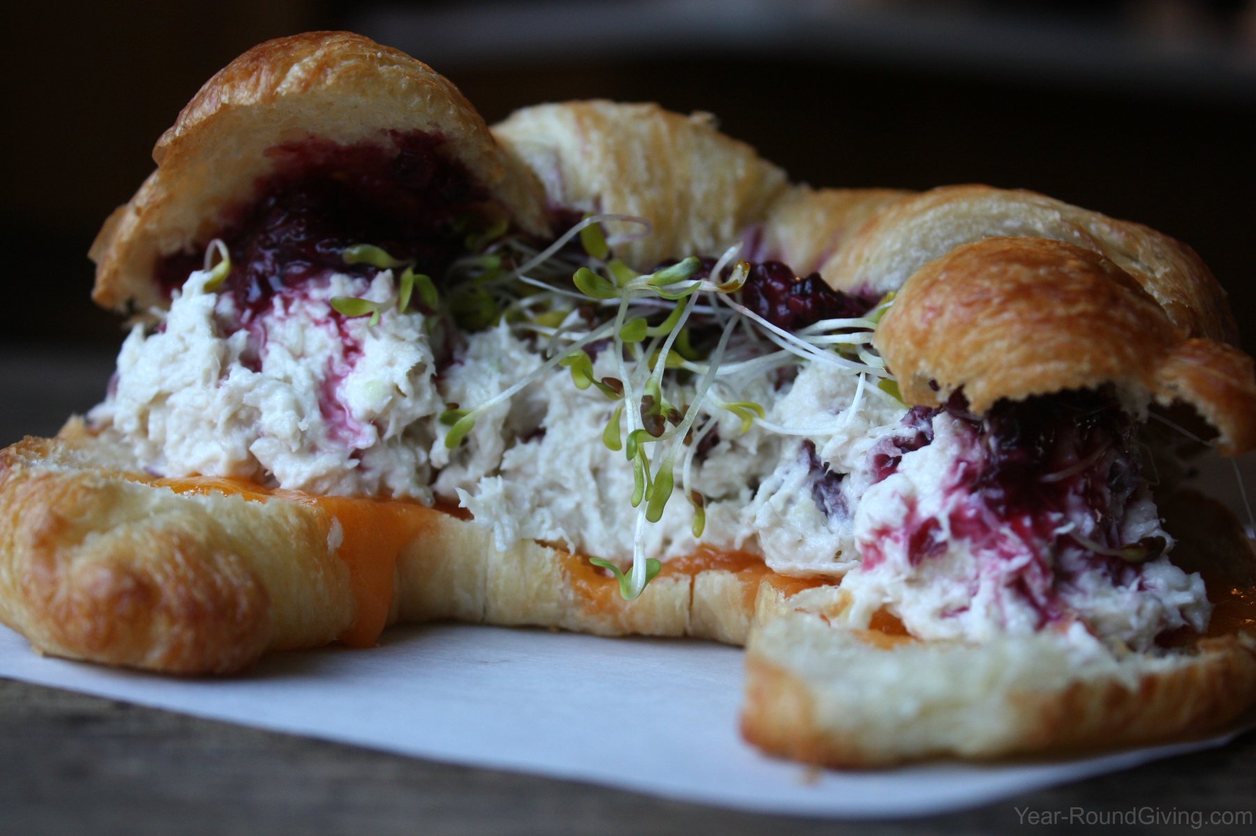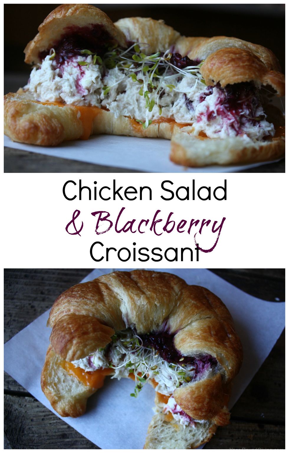 A homemade fresh blackberry sauce spread over a croissant with chicken salad, sprouts and sharp cheddar.