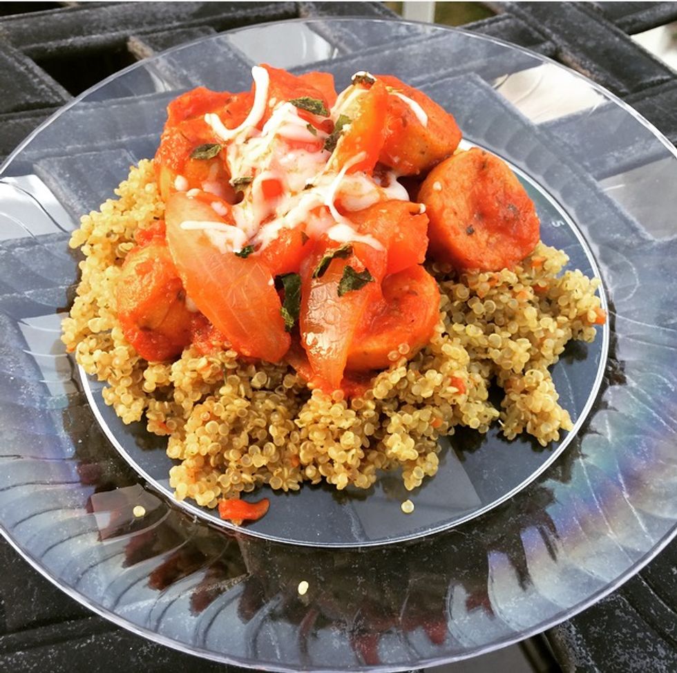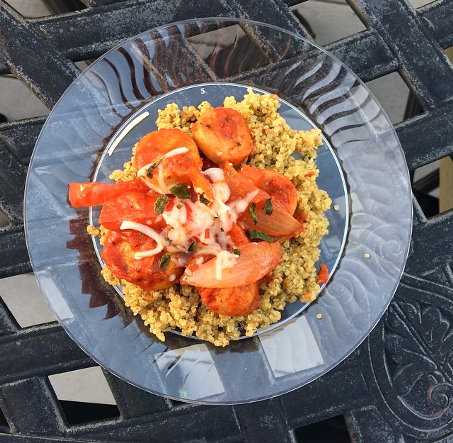 5 ingredient dinner using chicken sausage and quinoa! This healthy quinoa recipe not only satisfies your taste buds but leaves you feeling full. So easy to make, there\\\'s no excuse not to try this healthy dish!