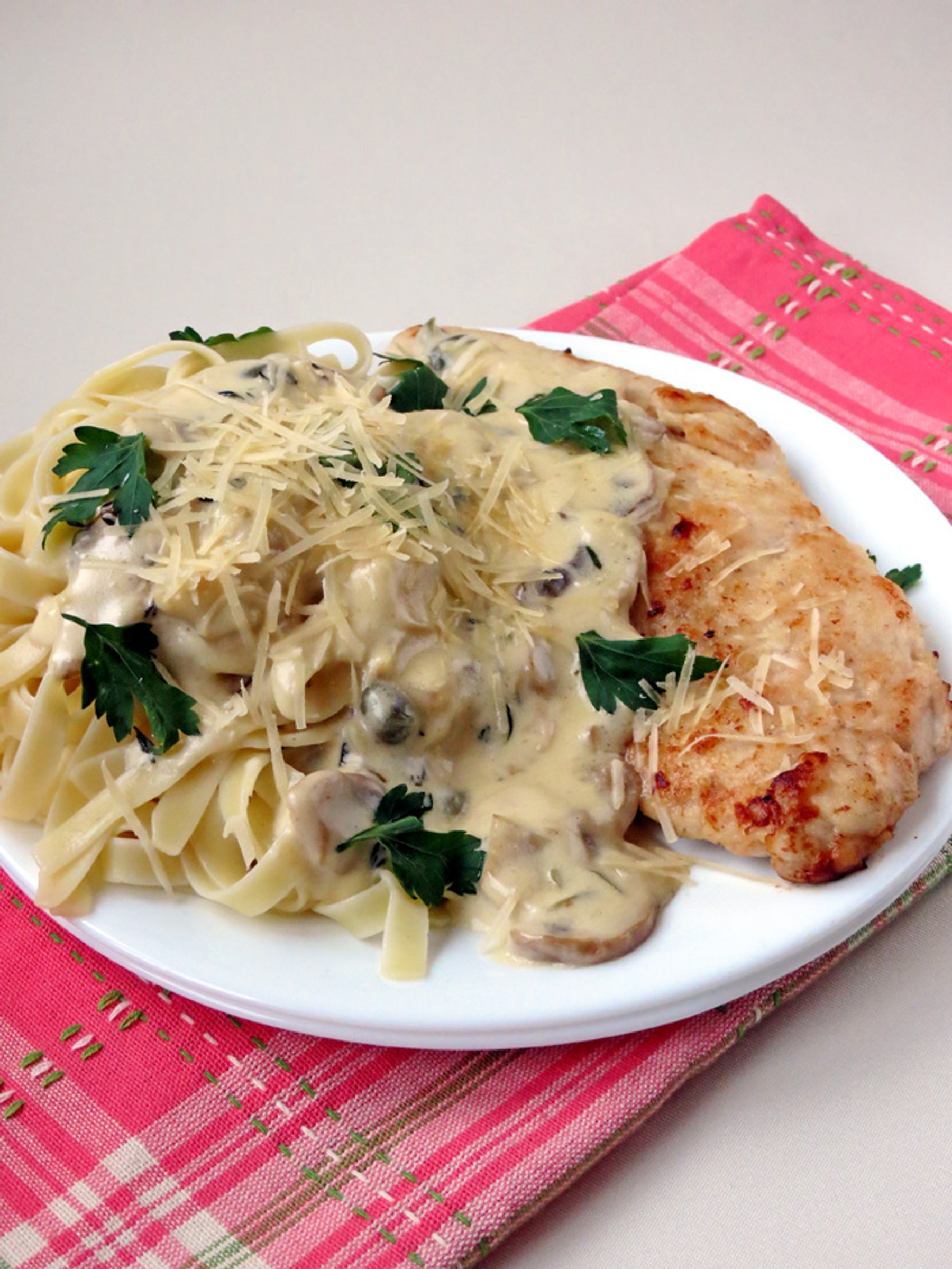 Tender Chicken Scallopini with Fettuccine topped with delicious and very rich mushroom, thyme and caper sauce.
