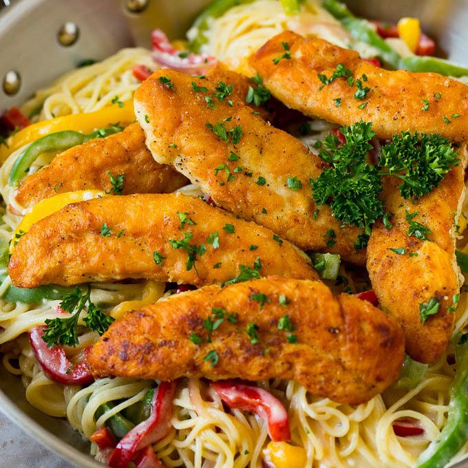 This chicken scampi recipe is golden brown chicken tenderloins with peppers and onions over pasta, all tossed in a white wine and butter sauce. It's a restaurant favorite that tastes even better when you make it at home!