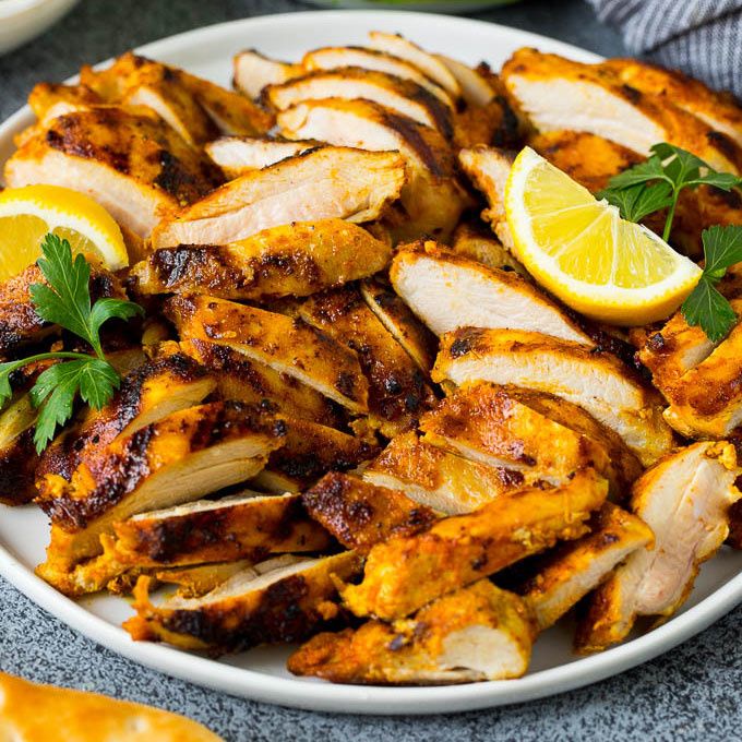 This chicken shawarma is tender chicken thighs coated in a flavorful marinade, then grilled or roasted to golden brown perfection. Slice the chicken and serve it with flatbread for a hearty and delicious meal.