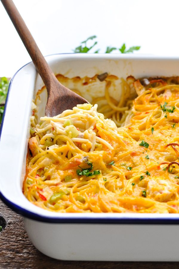 Chicken Spaghetti Casserole is classic comfort food! The simple dish combines tender pasta with chicken and vegetables in a creamy, cheesy sauce. It's an easy dinner that you can make in advance, or a delicious meal to bring to a friend in need. Serve the casserole with a salad and corn muffins or biscuits for the perfect family supper!