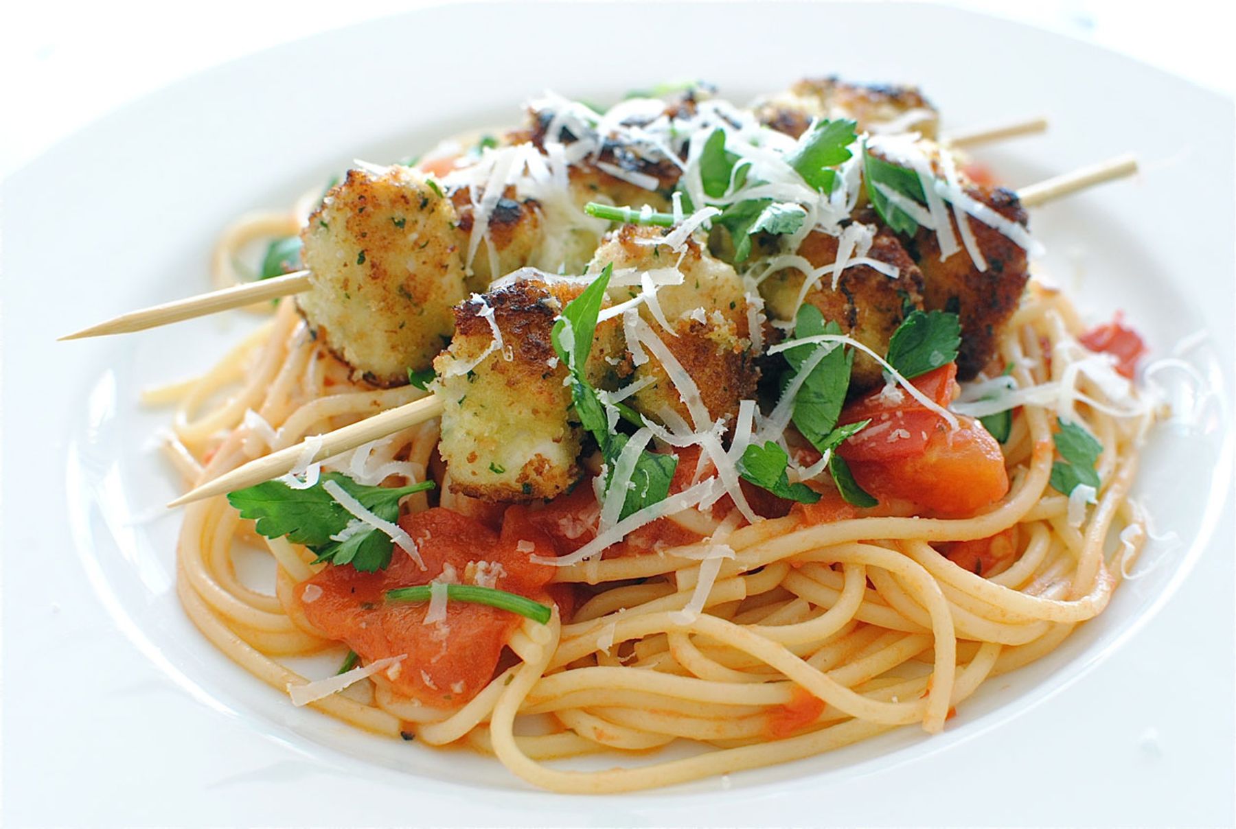 Serve chicken spiedini over a bed of spaghetti. Garnish with more parsley, freshly grated parmesan and some lemon juice!