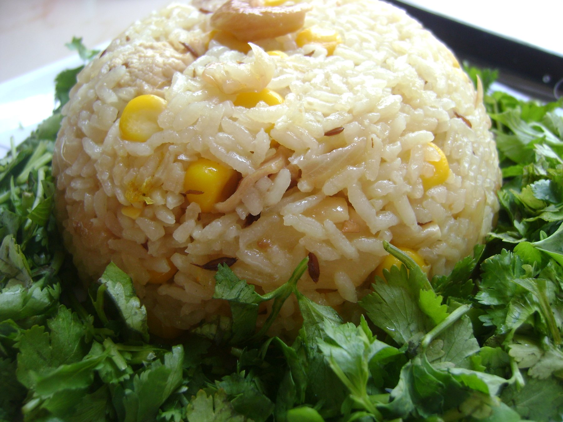 1 1/2 cups rice, 1 cup sweet corn, 1 cup boneless chicken pieces, 1 small chopped onion, 4 cloves of chopped garlic, 4 cups chicken stock, salt to taste.